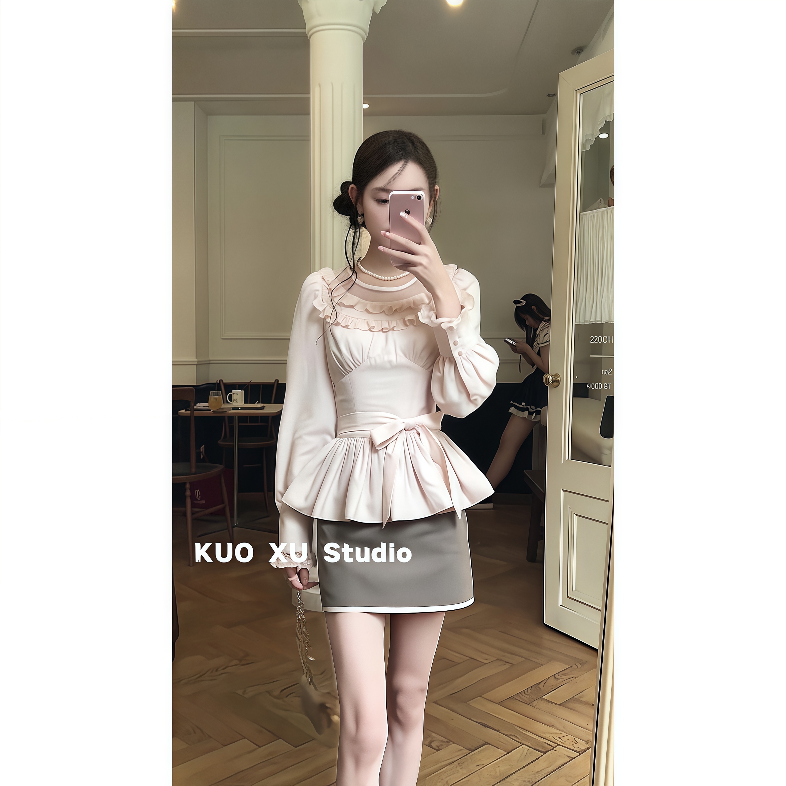 绑带上衣撞色半裙包臀裙短裙一步裙套装 早秋圆领收腰甜美长袖 衬衫