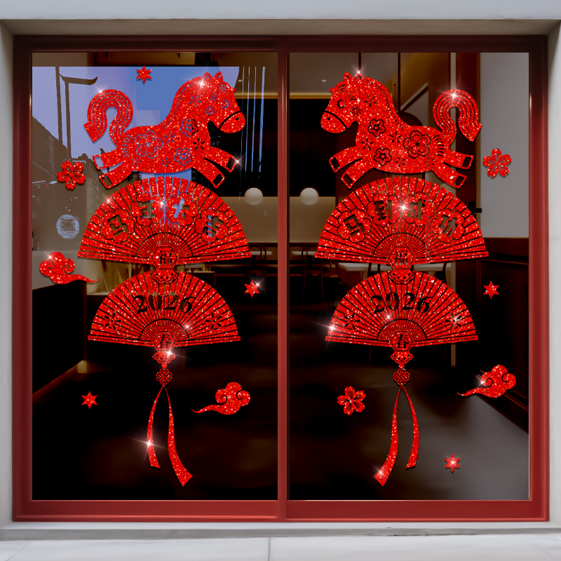 2026新年装 饰贴纸春节折扇窗花静电玻璃门贴用品公司商场马年布置