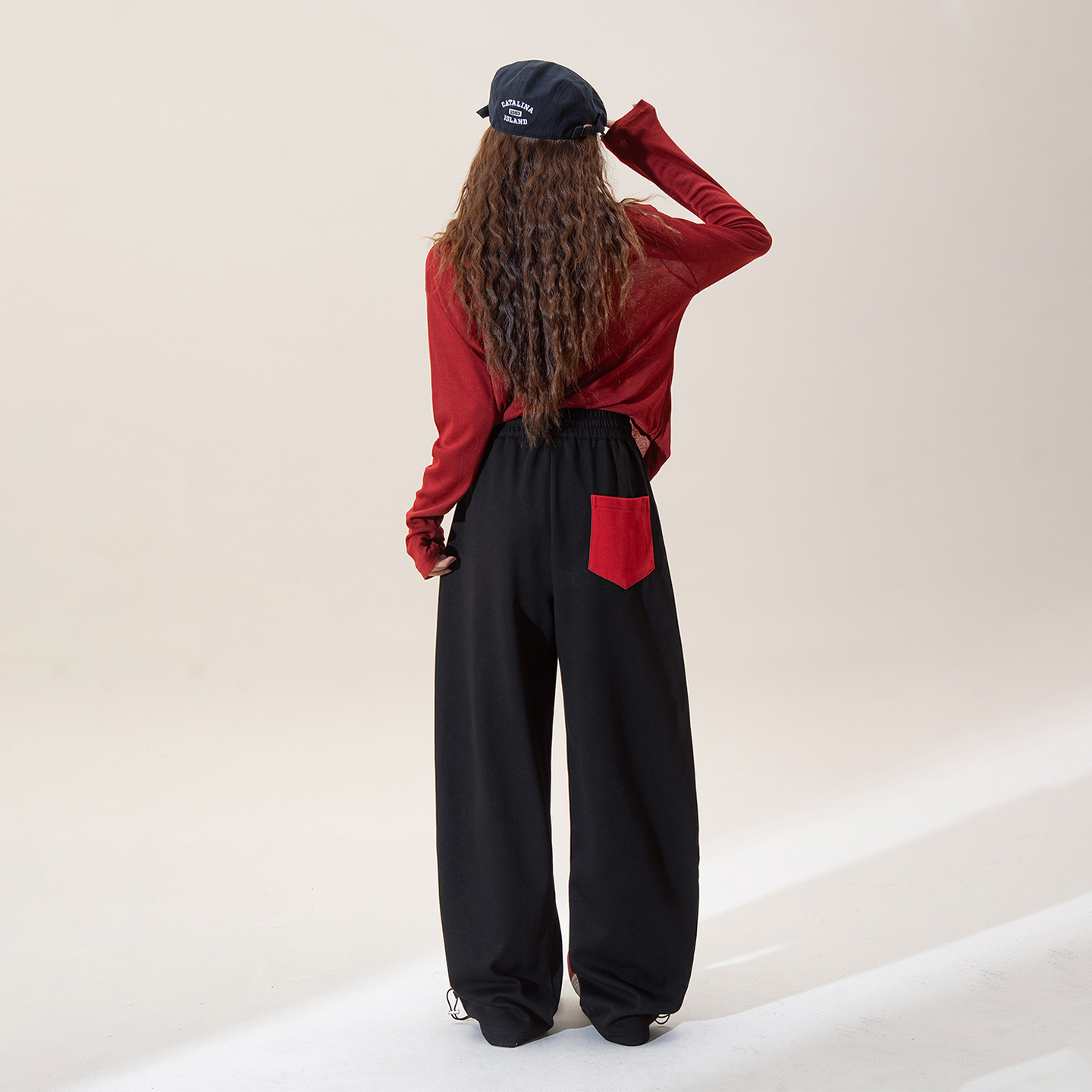 宽松直筒阔腿运动裤 新款 子 女秋季 藏青色苹果刺绣高腰抽绳休闲卫裤