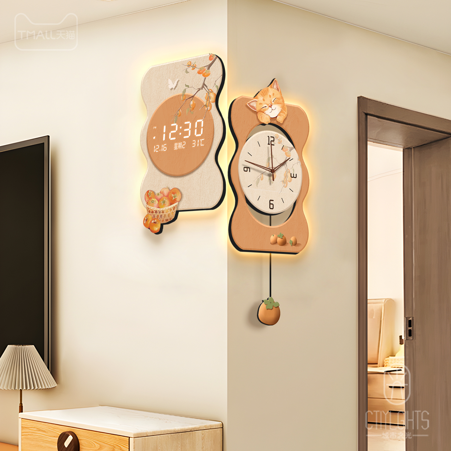 柿柿如意客厅拐角挂钟2025新款 万年历电子钟表中古风双面转角时钟