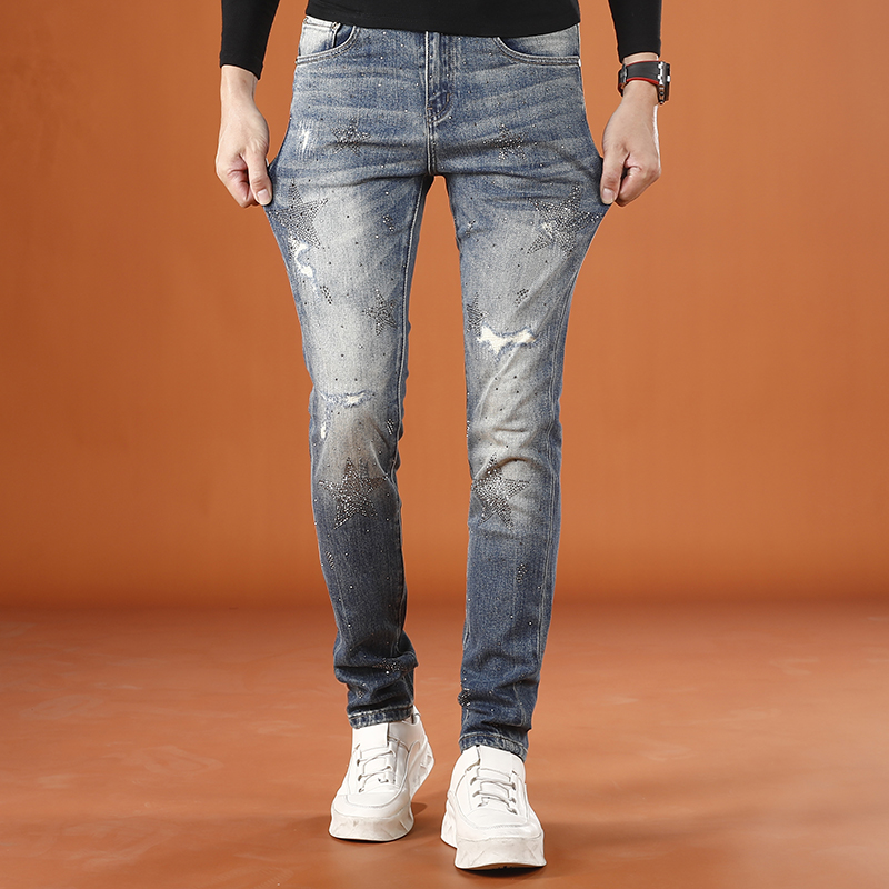 子男2025秋冬款 小脚长裤 弹力男士 修身 潮 牛仔裤 高端潮牌烫钻破洞裤
