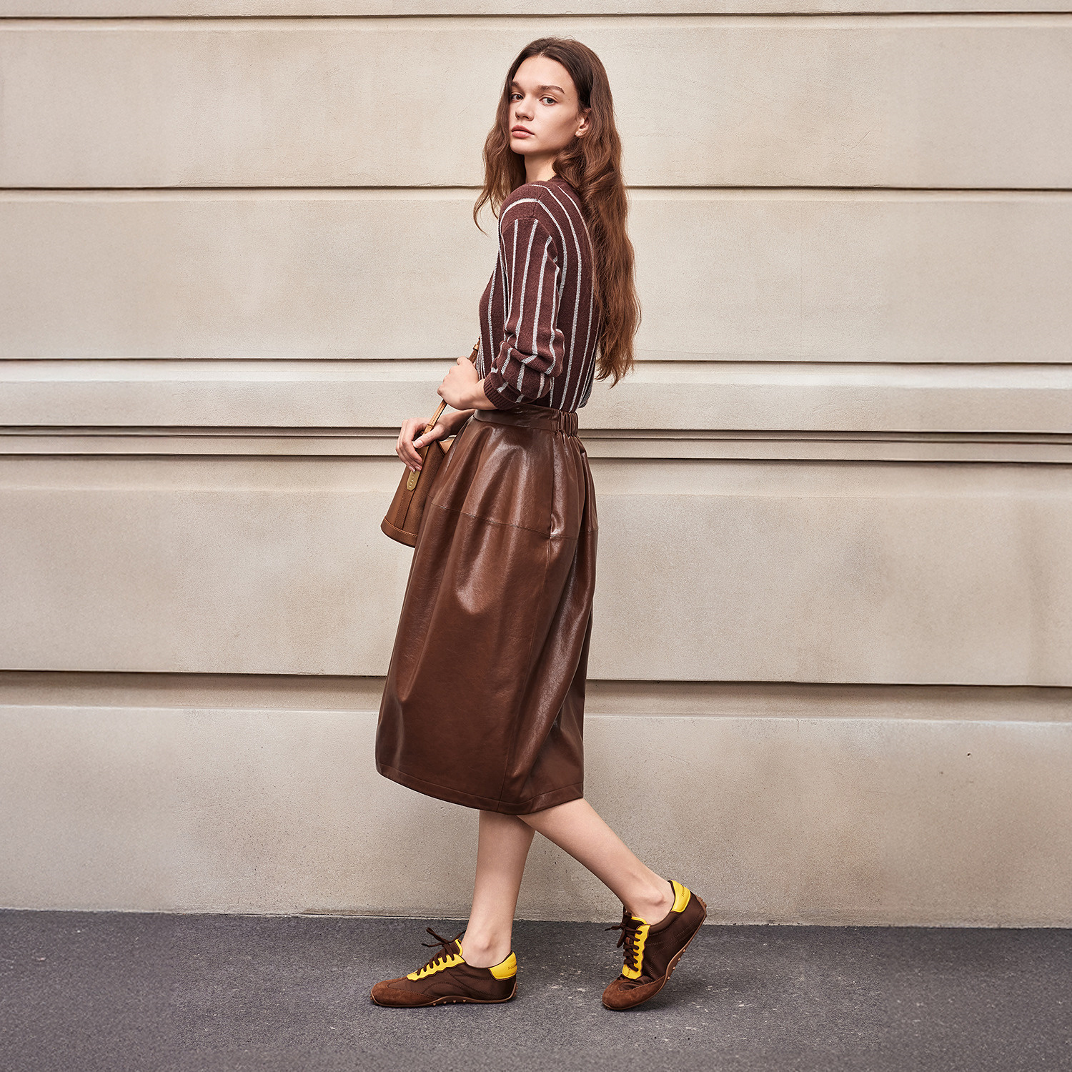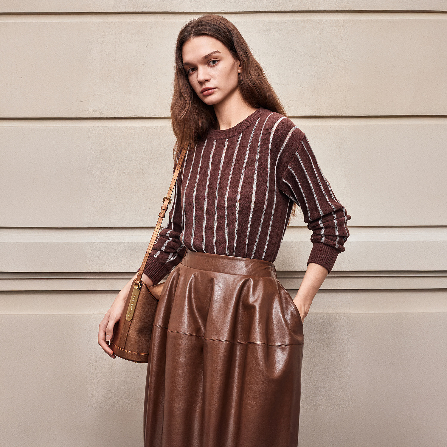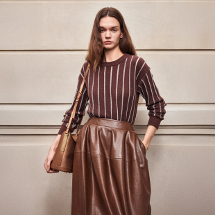 BCBG25早秋新款 气质初剪羊毛混纺撞色镂空条纹落肩圆领女毛衣 时尚