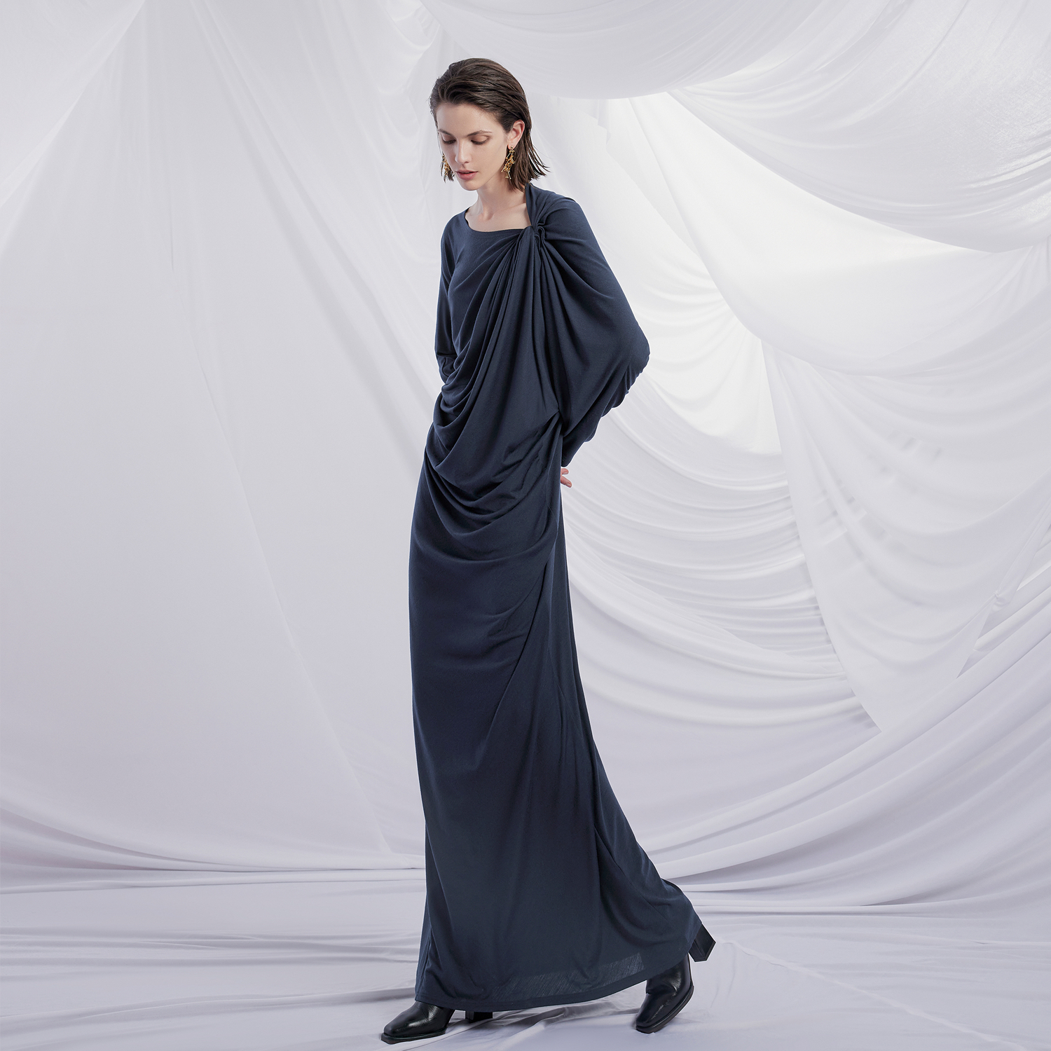 TU女装 立裁褶皱长裙子 极简松弛显瘦斜领羊毛气质连衣裙2025秋新款