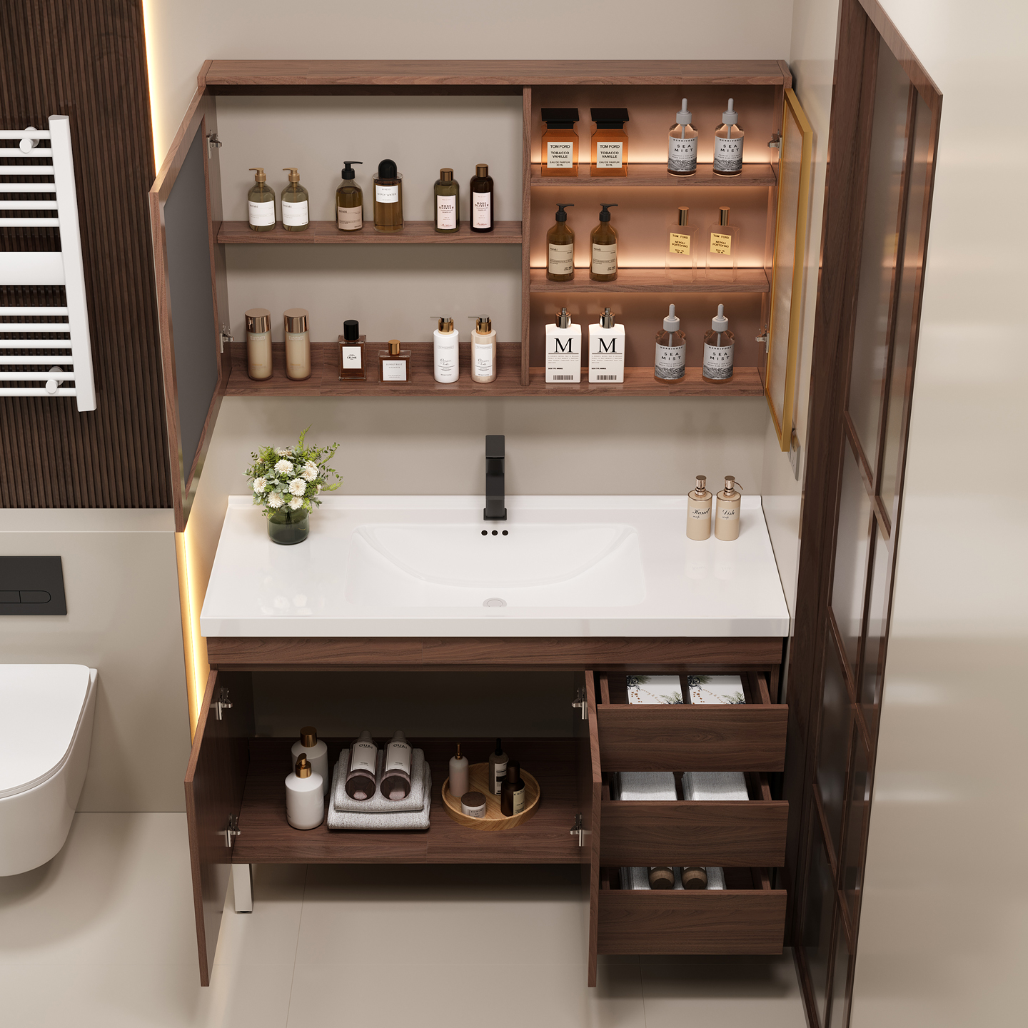 浴室柜包安装 卫生间新中式 胡桃木智能浴室柜组合陶瓷一体盆落地式
