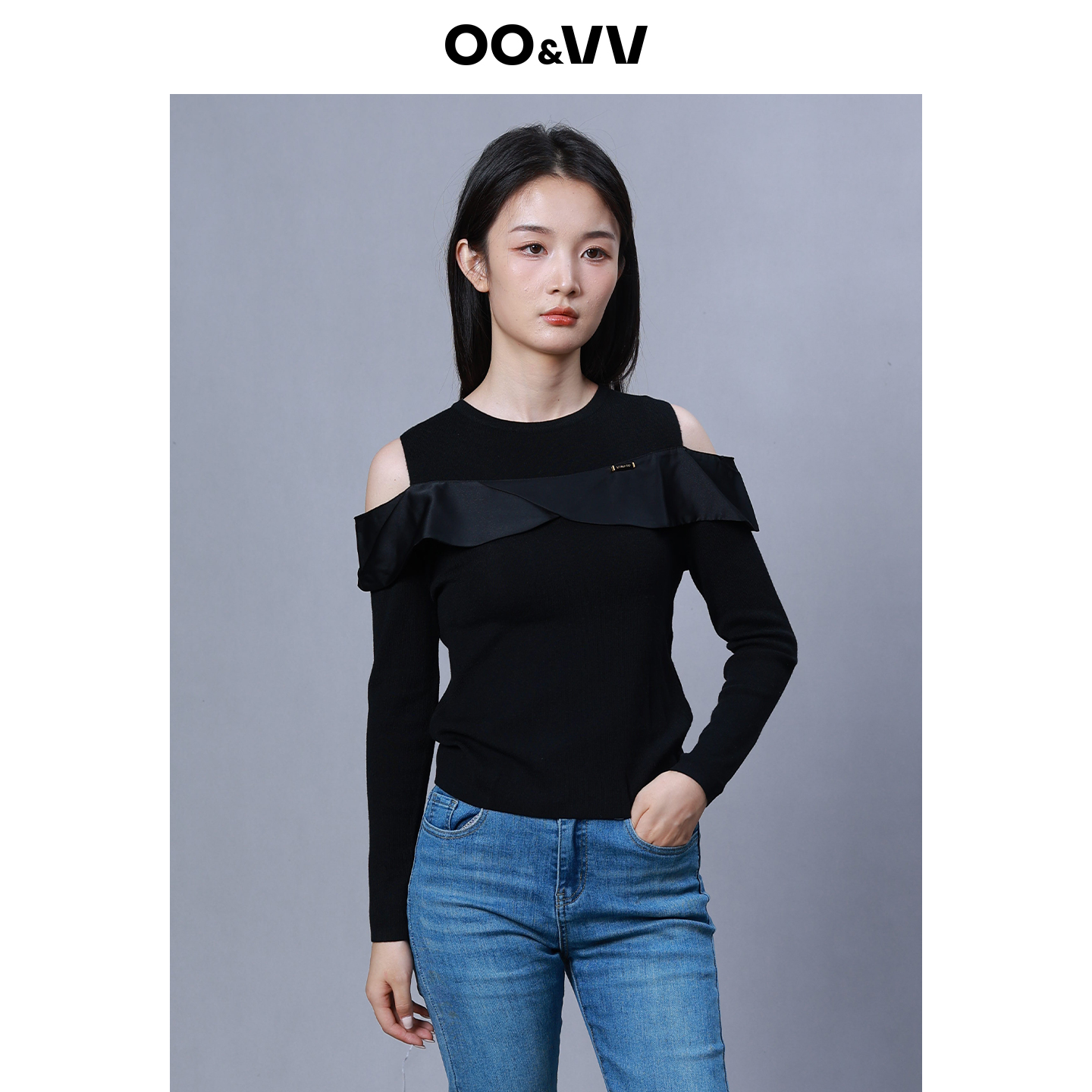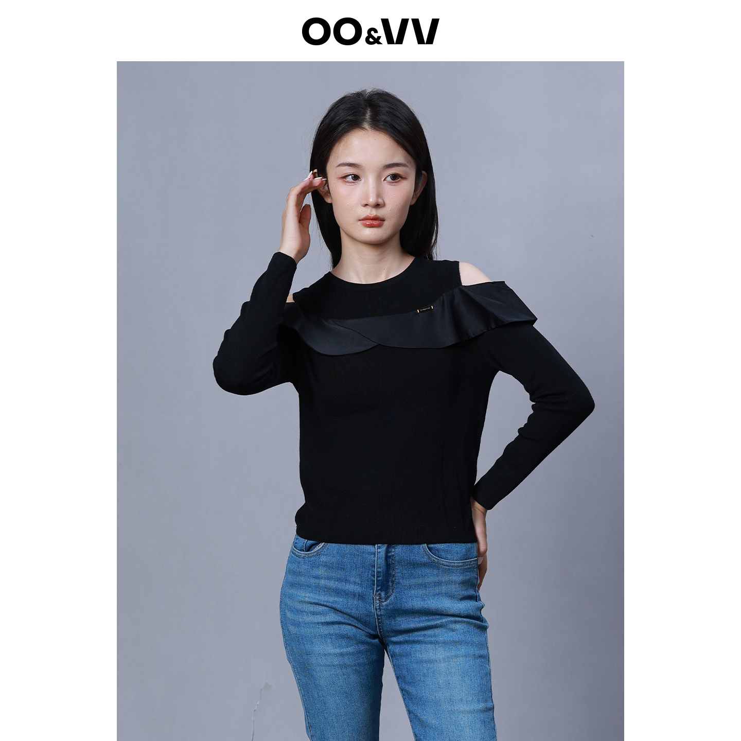 女2025秋新针织上衣 饰露肩针织羊毛衫 oo&vv时尚 设计荷叶边立体装