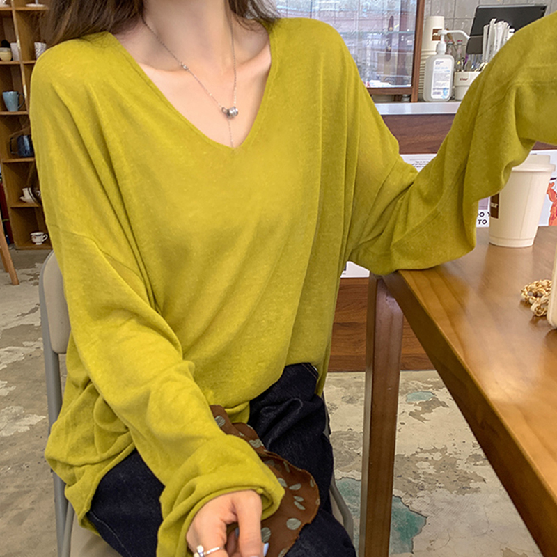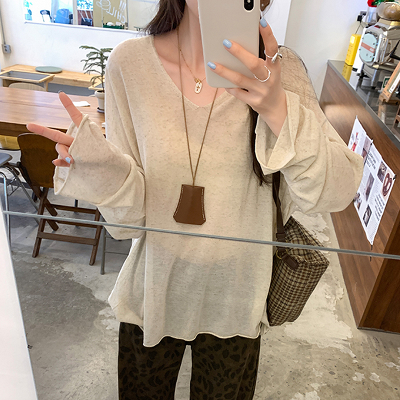 t恤针织上衣 慵懒松弛感轻薄微透长袖 麻杏色v领宽松防晒罩衫 女秋季