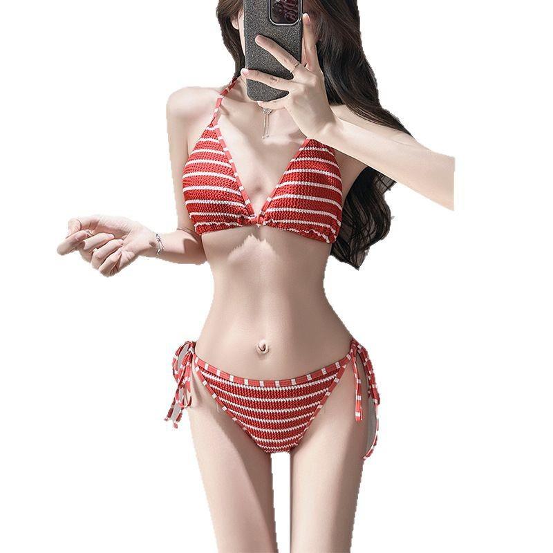 性感辣妹比基尼泳衣纯欲分体三件套度假条纹短裤 温泉海边沙滩泳装