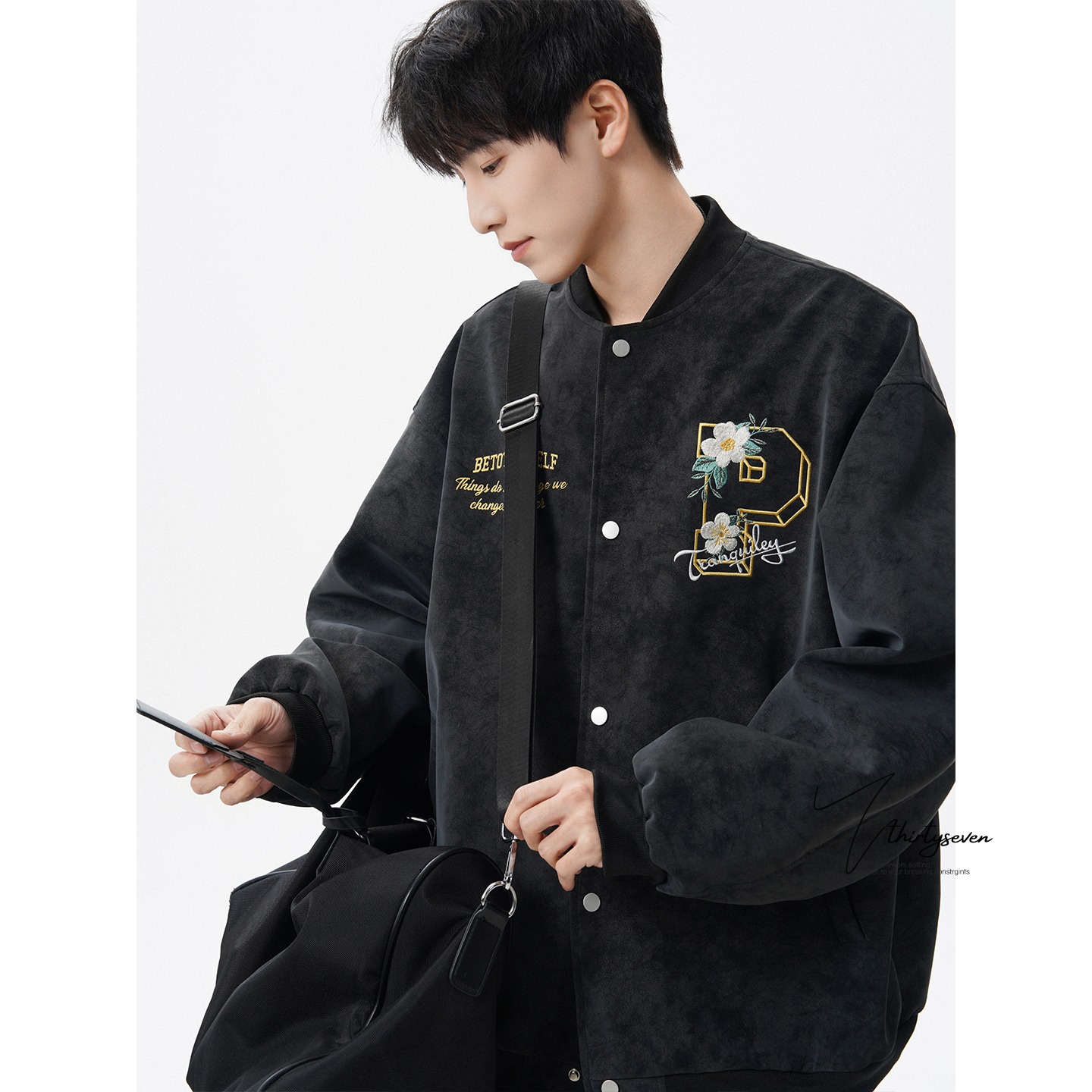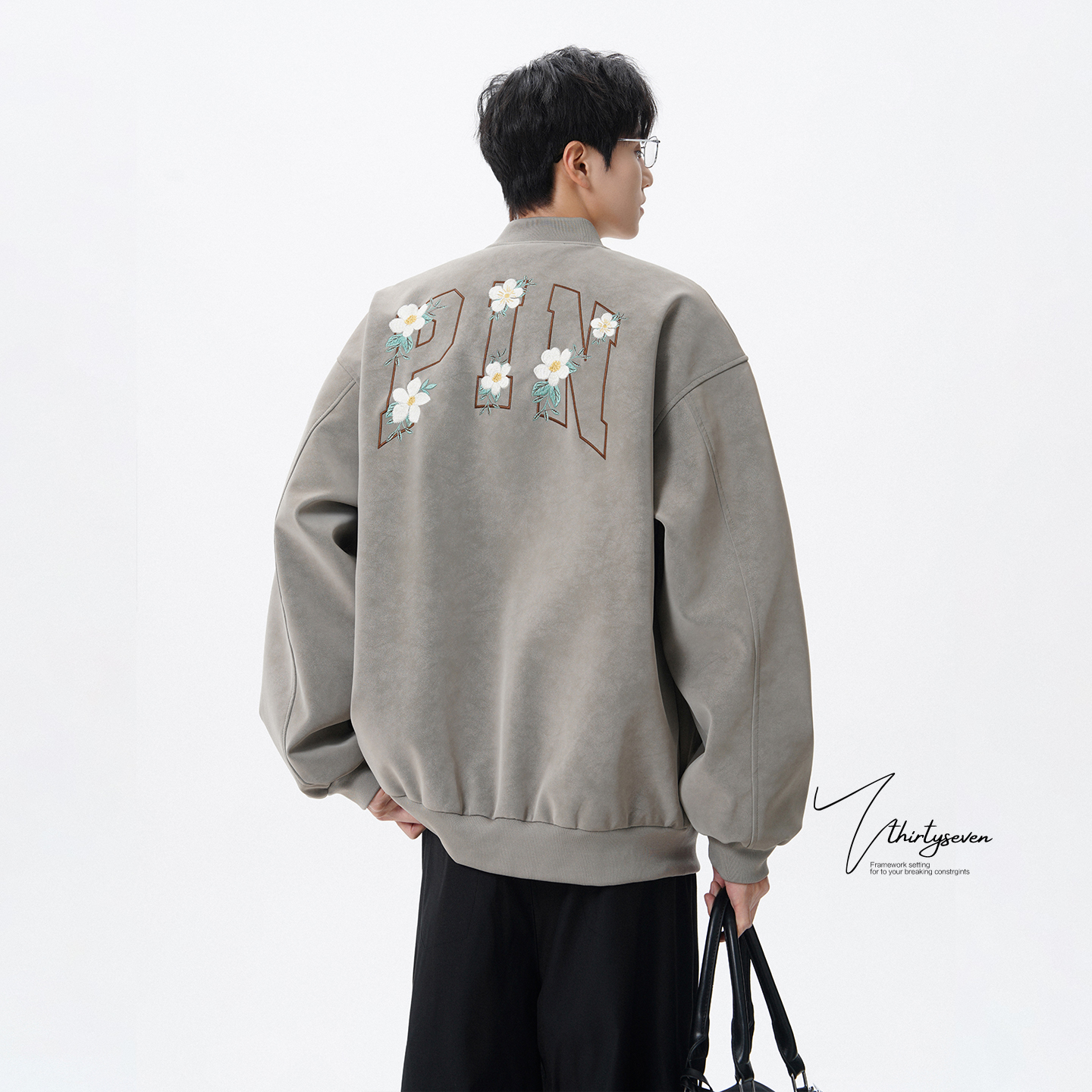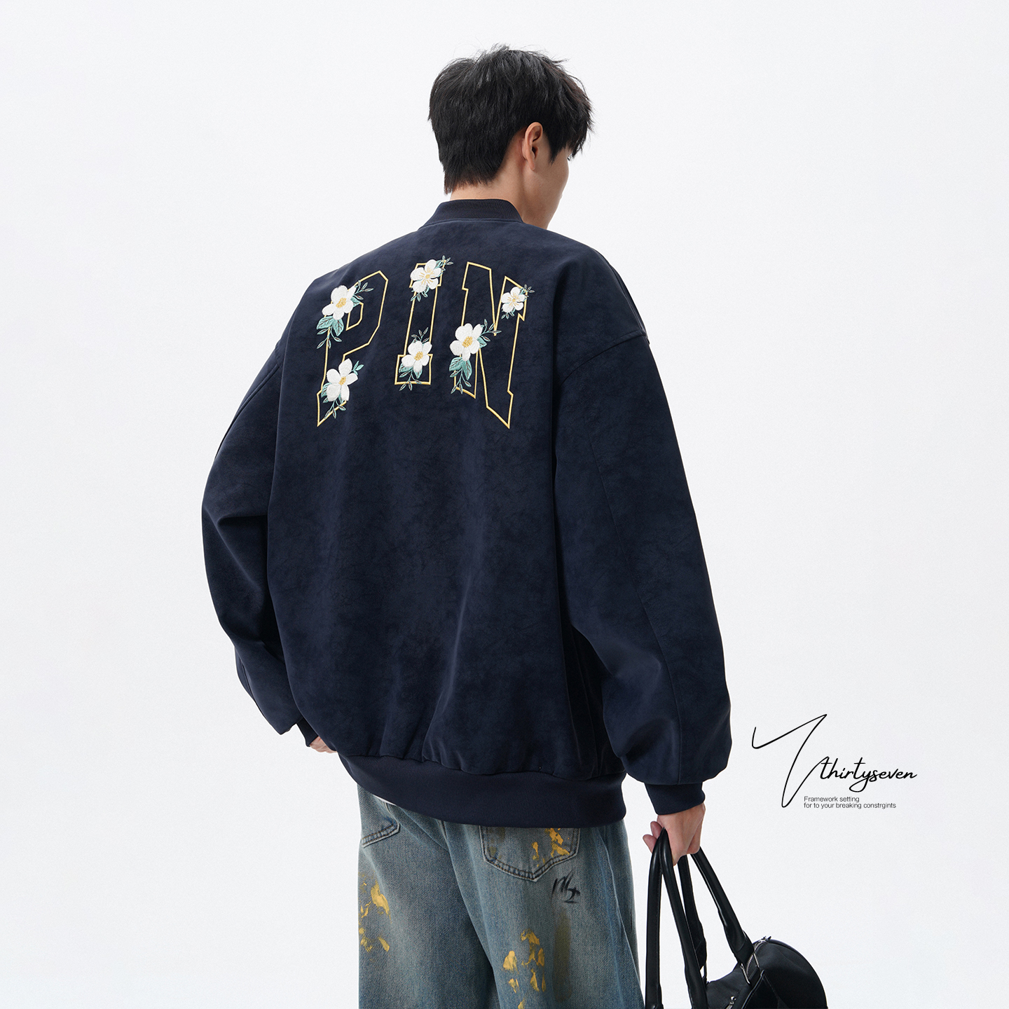V37国潮山茶花刺绣运动皮夹克男秋季 街头痞帅棒球服皮衣外套 美式