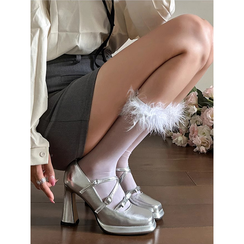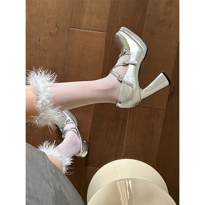 蝴蝶结粗跟超高跟鞋 女防水台方头单鞋 浅口 银色玛丽珍鞋 羊皮版