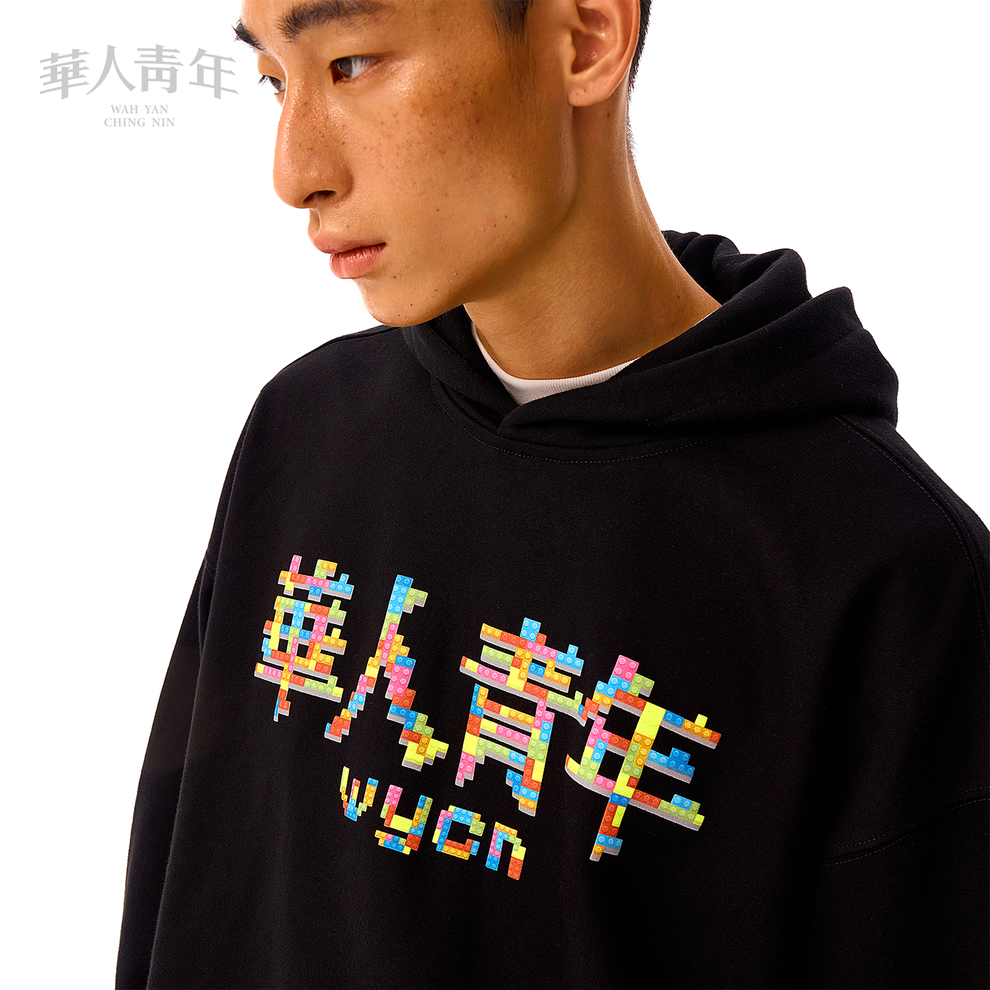 华人青年积木发泡LOGO印花连帽卫衣情侣款 校园套头宽松外套上衣潮