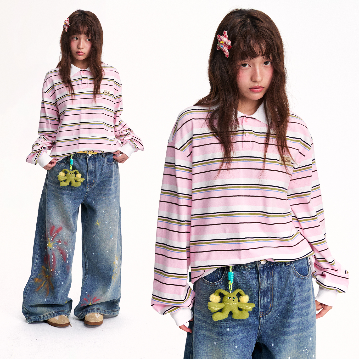 修身 森马POLO衫 复古辣妹夏季 设计感绑带美式 印花上衣小心机 女短款