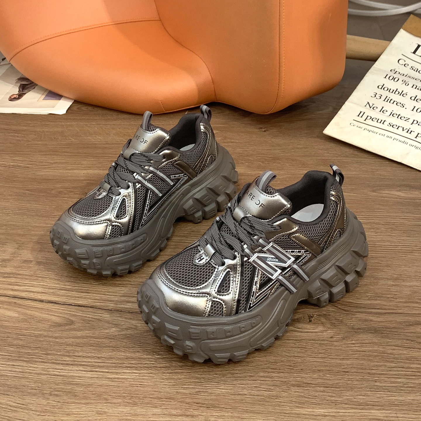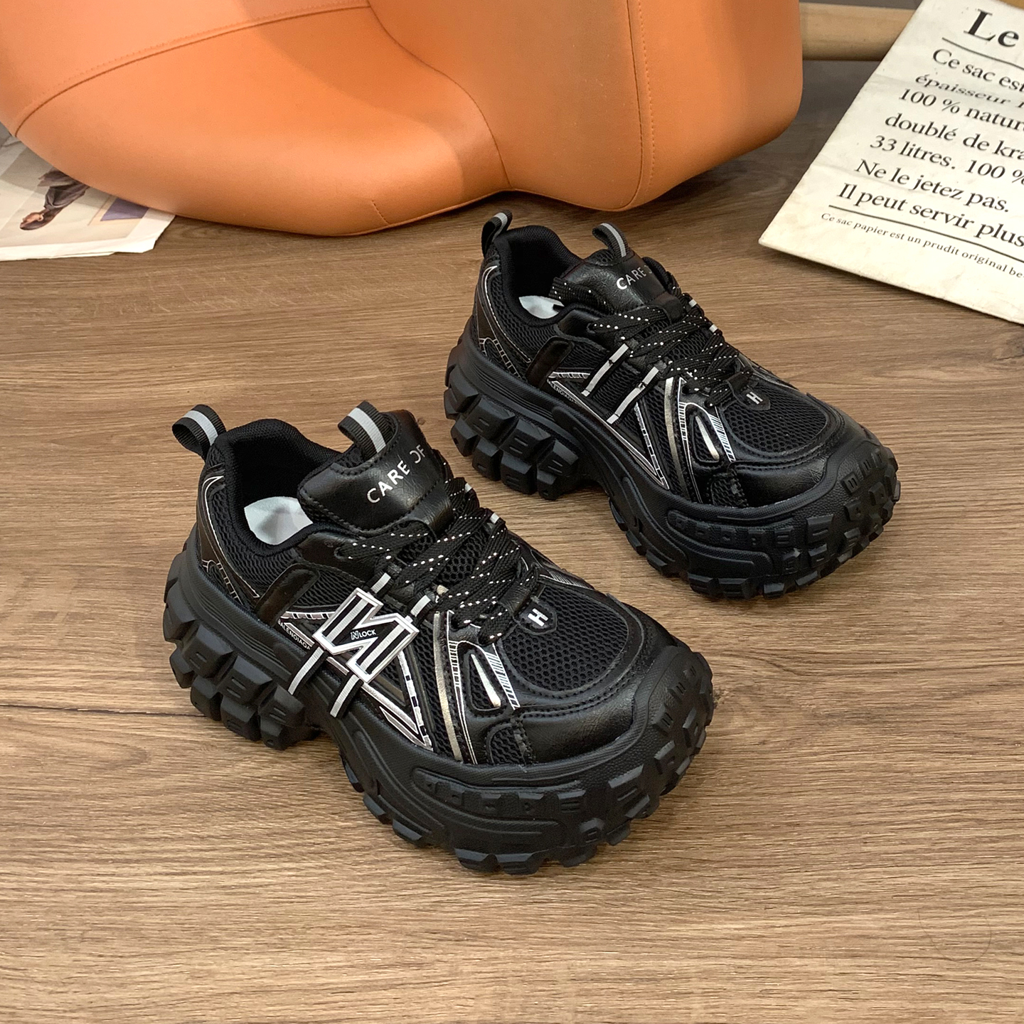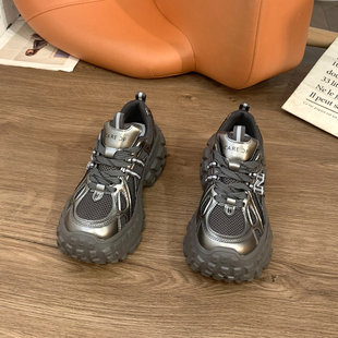 百搭厚底增高黑色运动休闲鞋 新款 子 女2025秋季 超轻便轮胎底老爹鞋