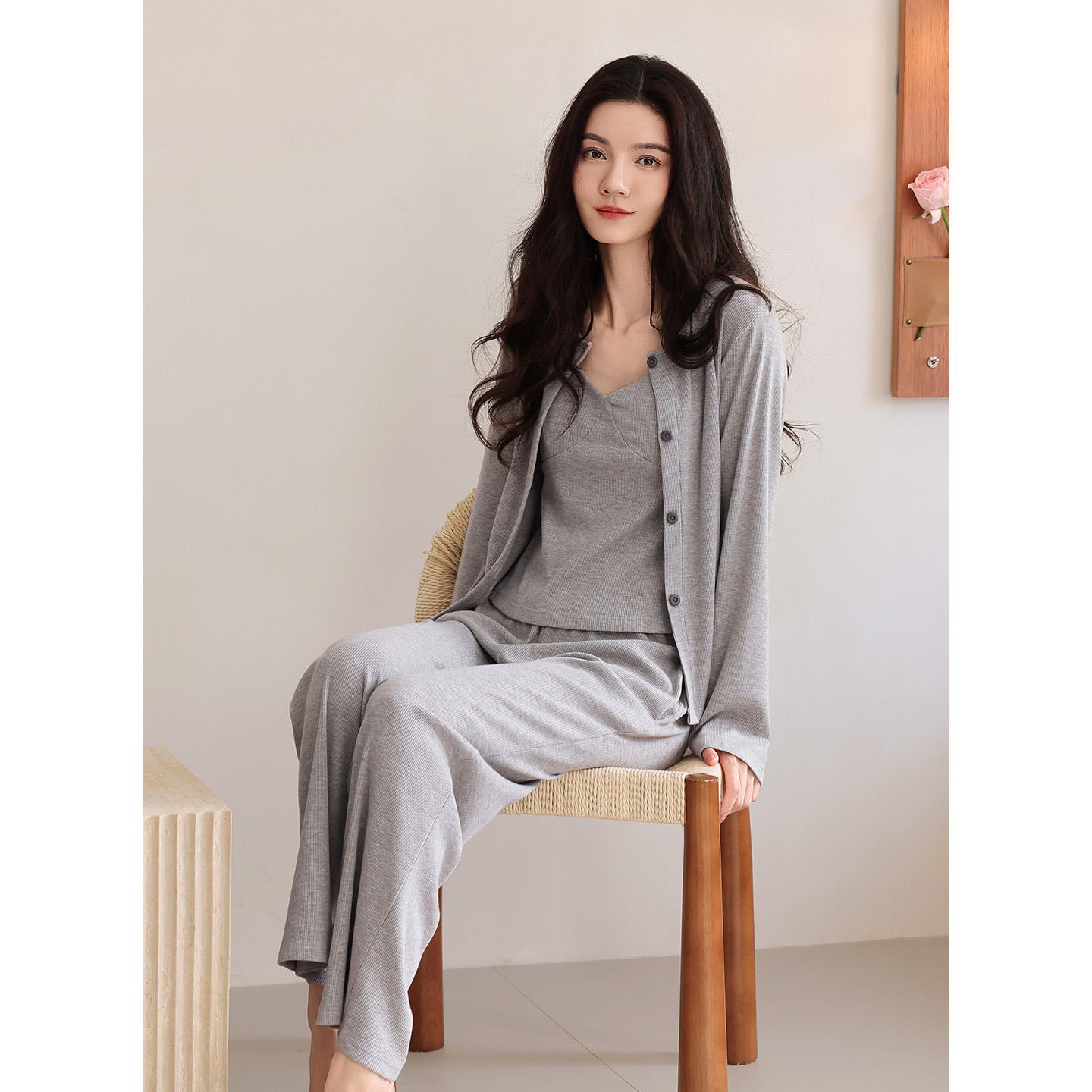 性感吊带背心带胸垫家居服三件套 2025新款 睡衣女春秋款 莫代尔长袖