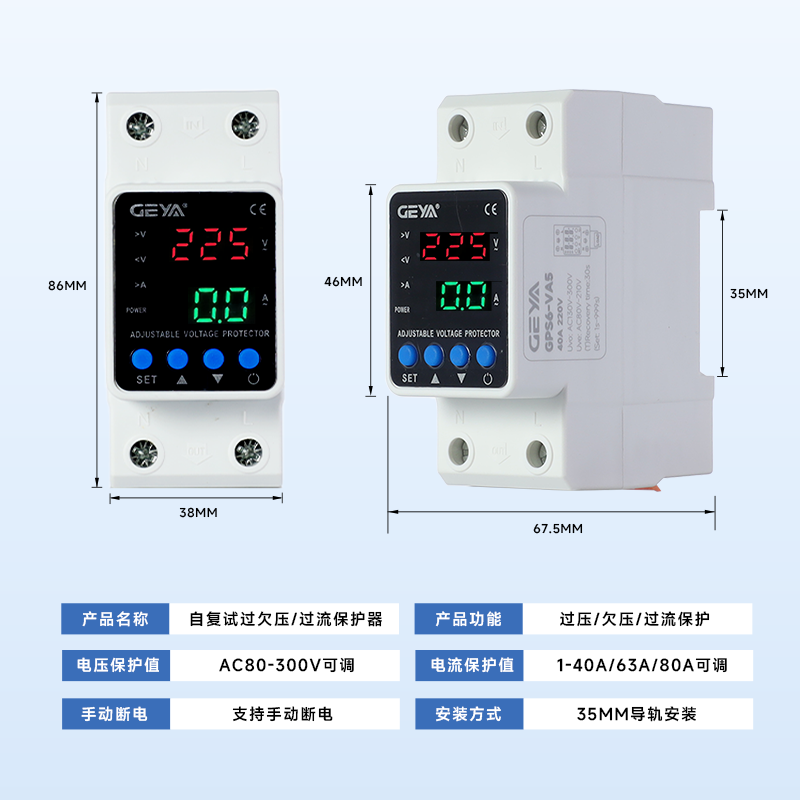 格亚数显可调过压欠压过流电路保护器自复式 63A电路监控自动复位