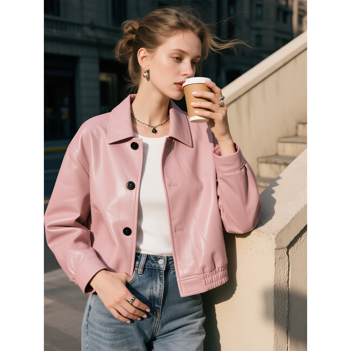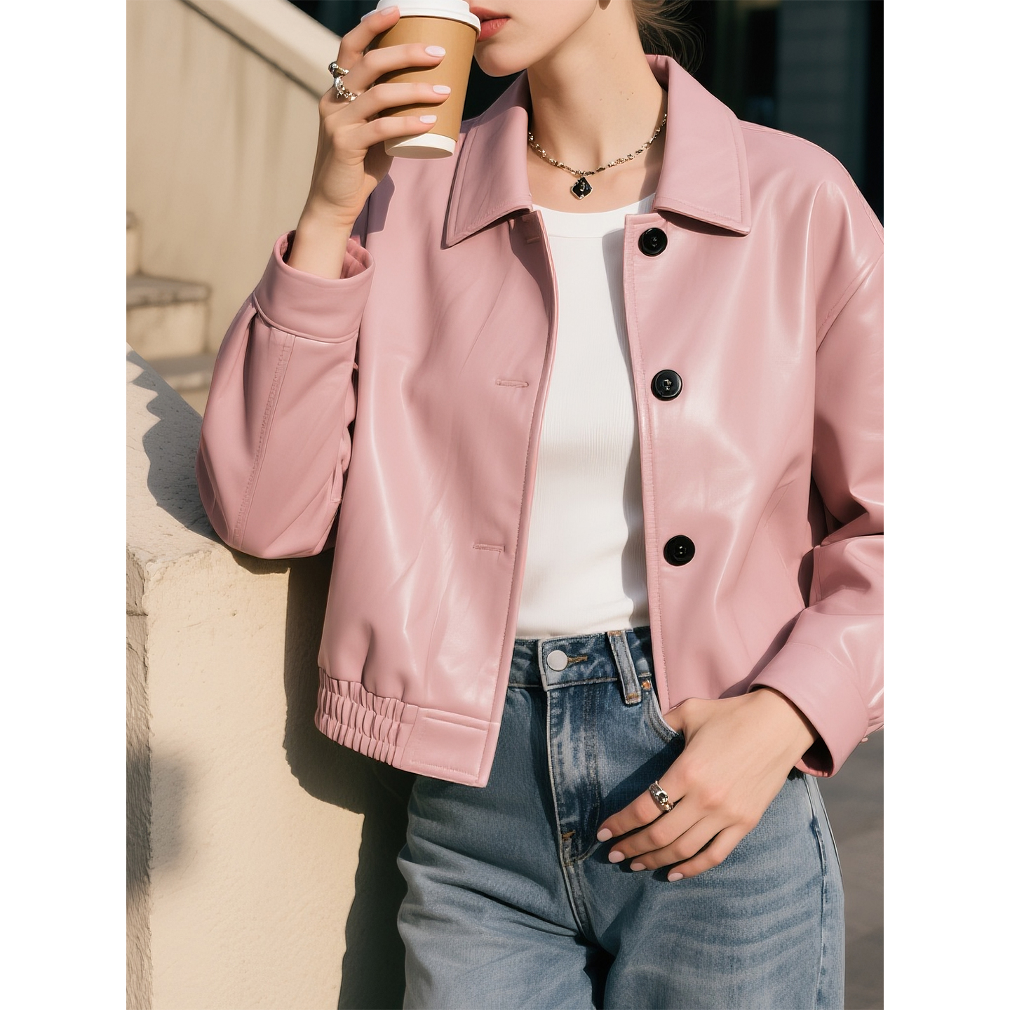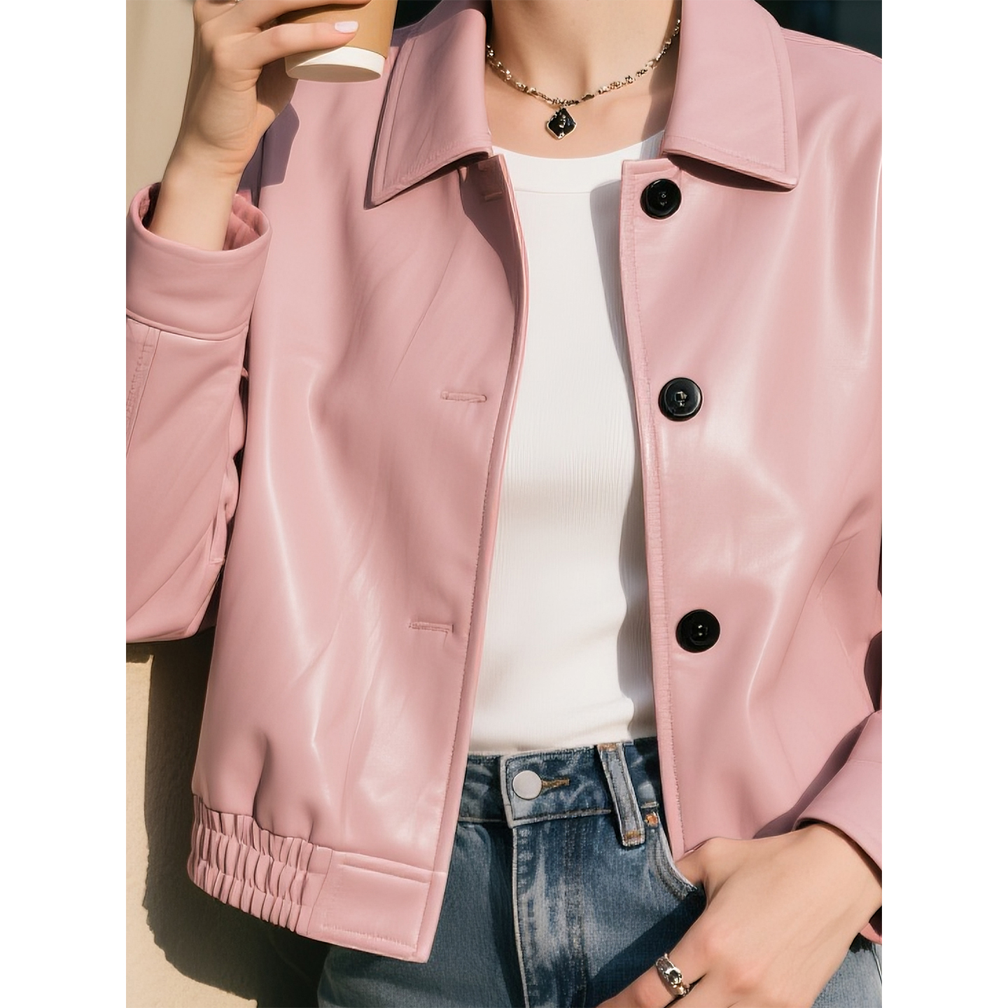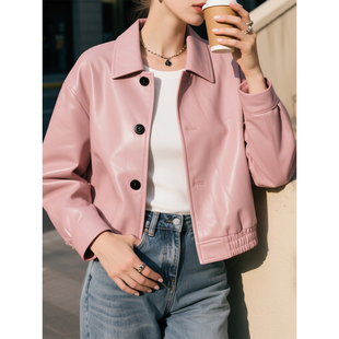 复古港风休闲夹克上衣 新款 皮粉色翻领长袖 皮衣外套女2025年秋季