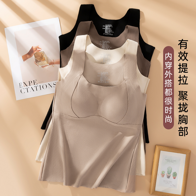 桑蚕丝保暖吊带背心女2025秋加绒加厚发热无痕自带胸垫一体内衣冬