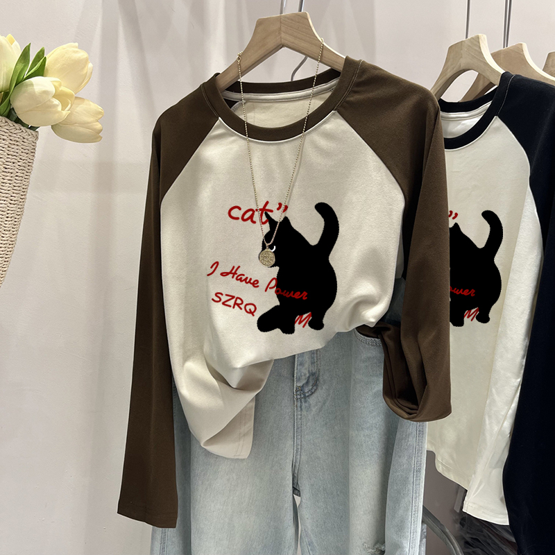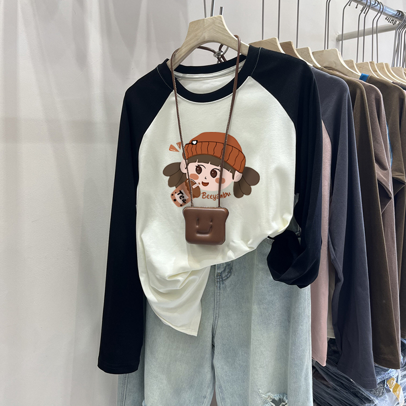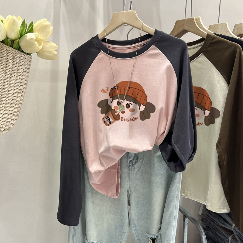 上衣 打底衫 慵懒风胖mm设计感休闲插肩撞色长袖 t恤女200斤秋冬大码