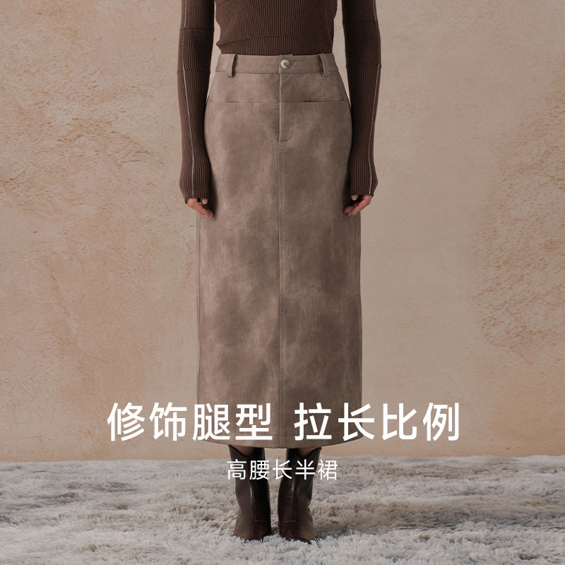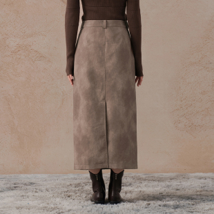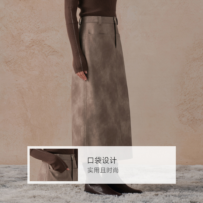 衣香丽影咖色直筒高纤皮裙女2025秋冬装 显高显瘦开衩半身裙子 新款