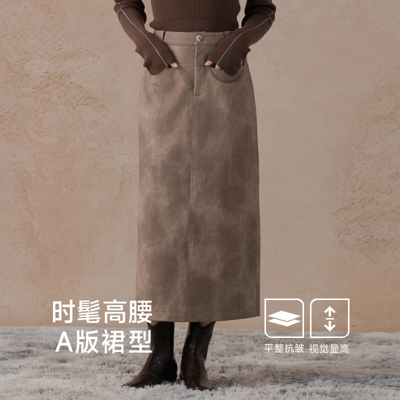 显瘦绒感中长裙子 休闲高腰修身 紫涵复古咖格直筒半身裙女冬季 新款