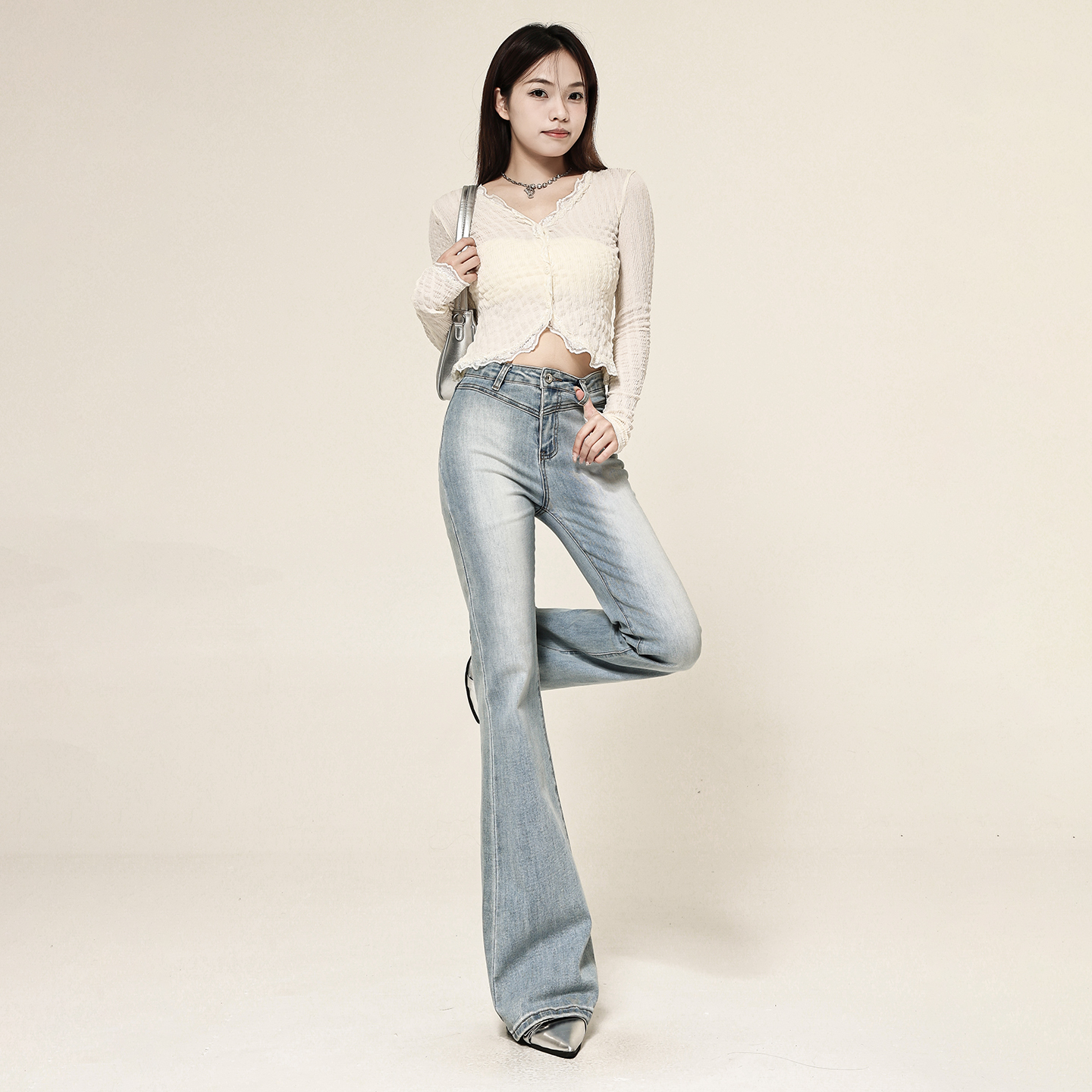 显瘦弹力喇叭长裤 女百搭辣妹高腰修身 复古浅蓝色微喇牛仔裤 美式