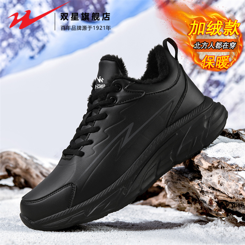 冬季 休闲软底运动减震跑步潮鞋 加绒皮面防水棉鞋 大码 男士 双星男鞋