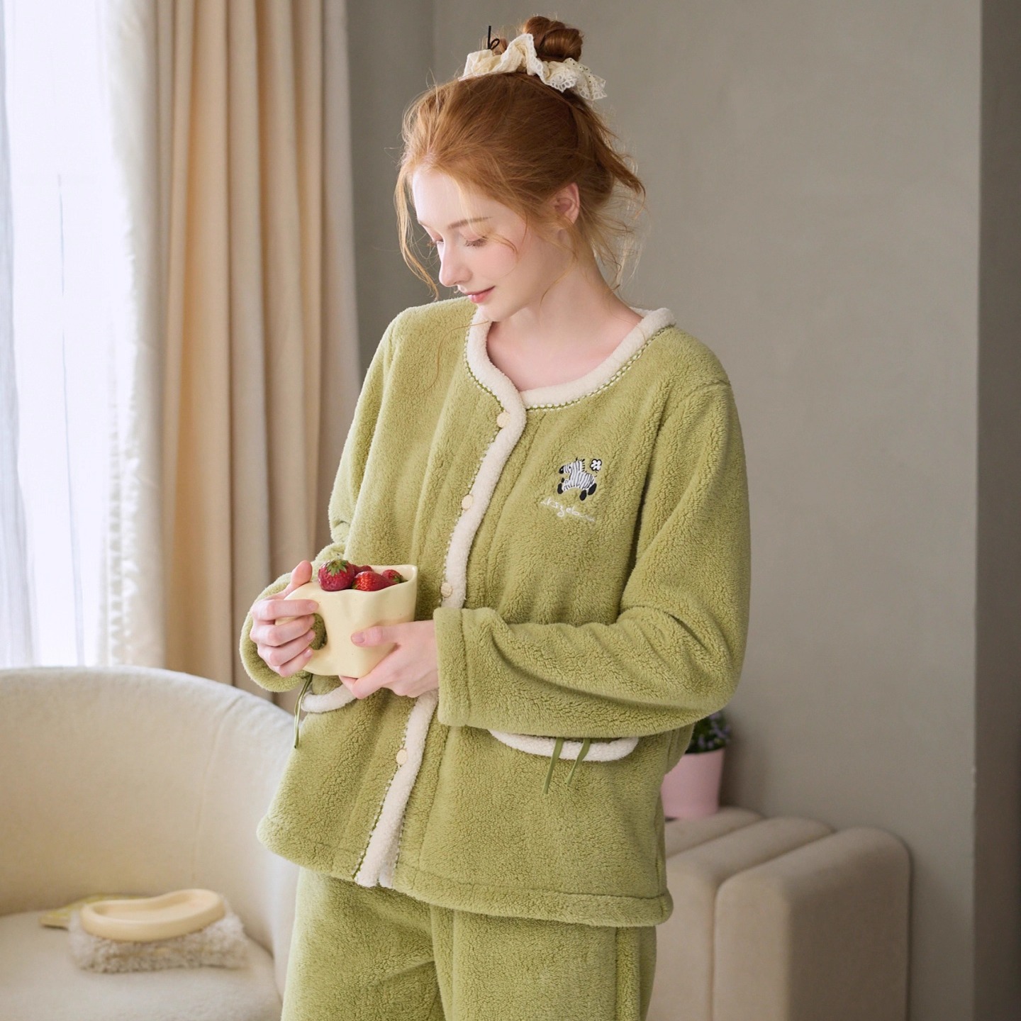 大码 春秋开衫 女士家居服 加厚珊瑚绒睡衣女冬法兰绒加绒套装 秋冬季