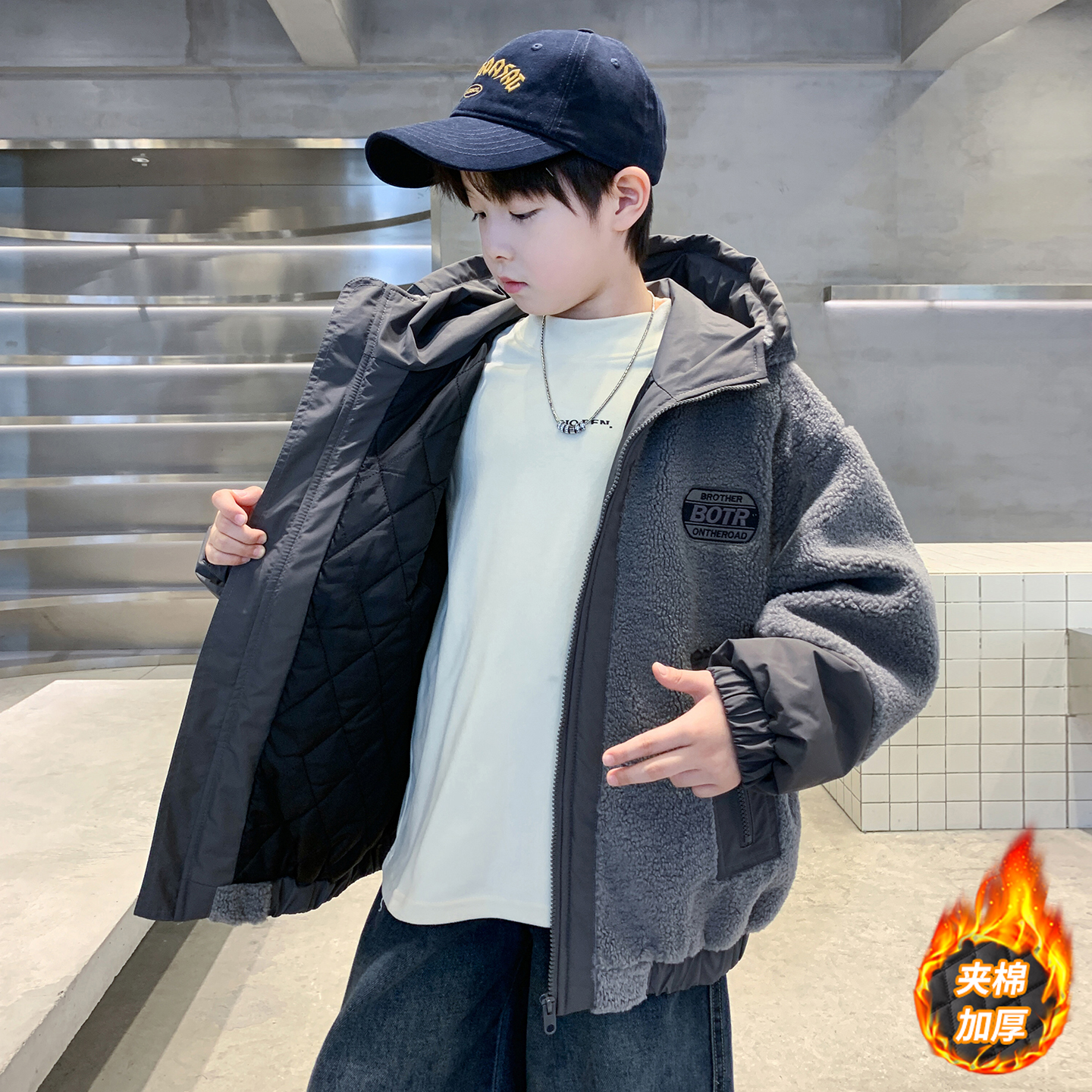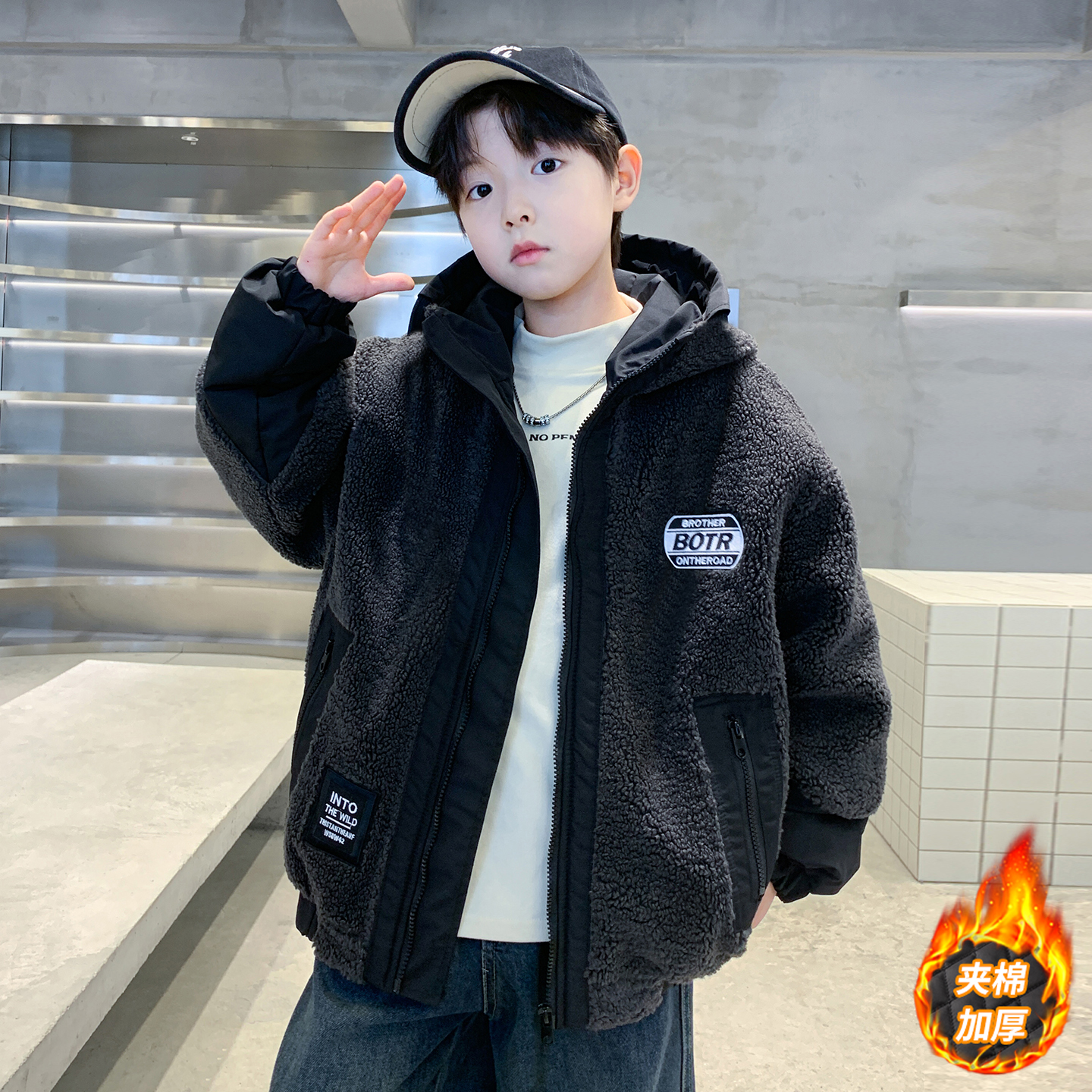夹棉保暖连帽上衣 洋气中大童秋冬季 儿童装 男童毛毛衣外套2025新款