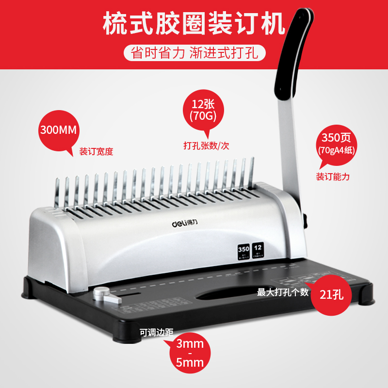财务凭证胶圈装 得力3870梳式 订机3872胶圈夹条打孔A3A4纸文件凭证标书打孔机梳式 订机21孔财务装 订机 装