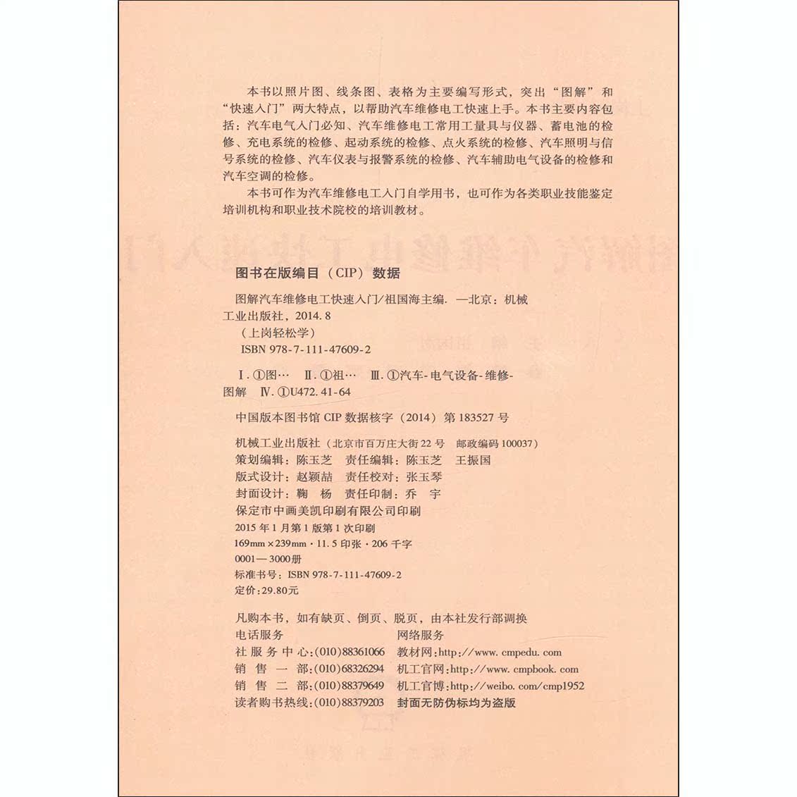 祖国海 机械工业出版 汽车维修电工入门自学书 职业技能鉴定培训机构教材 社9787111476092 电气设备维修 图解汽车维修电工快速入门