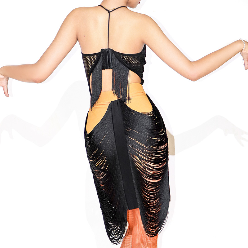 Dancebaby拉丁舞服练习服秋冬高级网纱体服半身流苏裙套装 DAS813