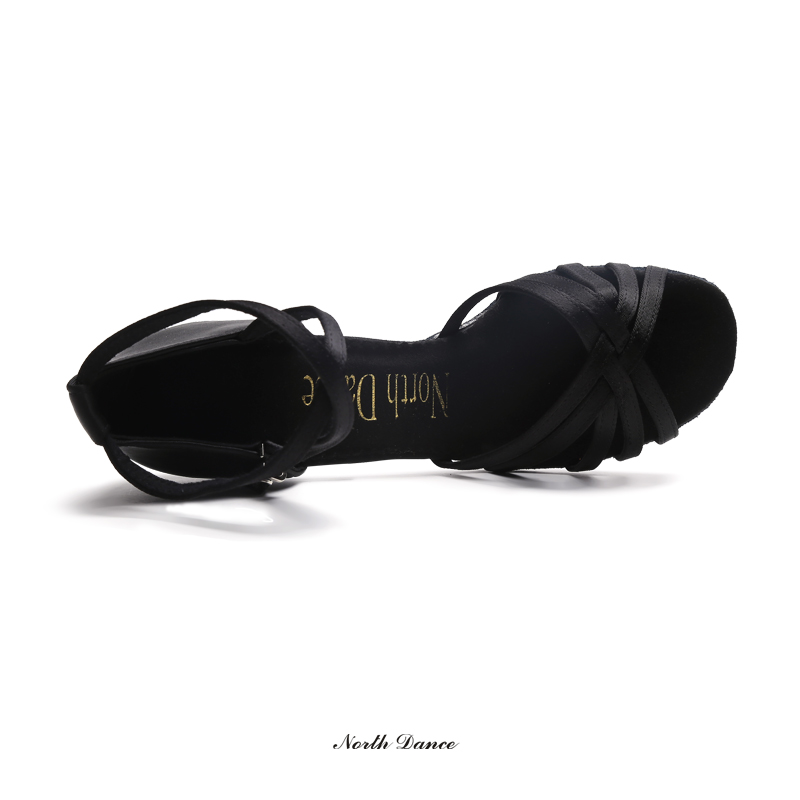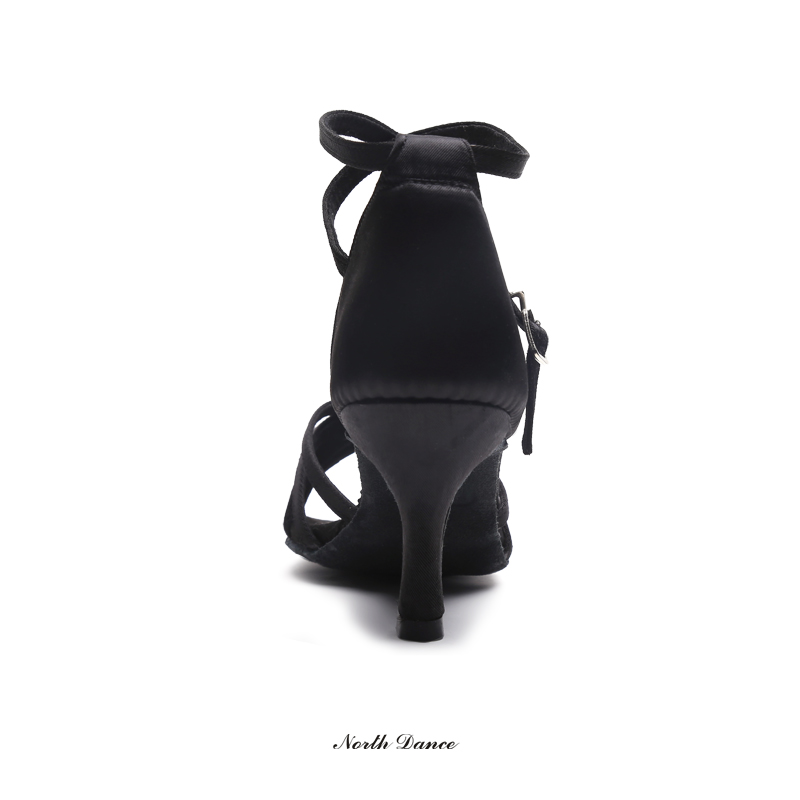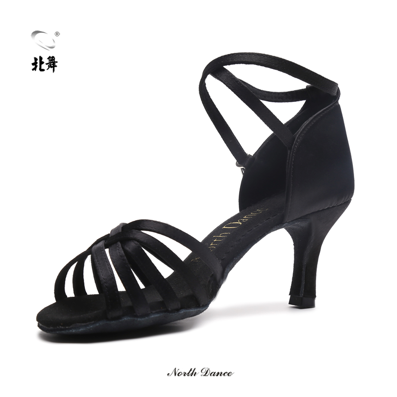 北舞拉丁舞蹈鞋 成人女中高跟黑色缎面软底初学广场交谊演出跳舞鞋