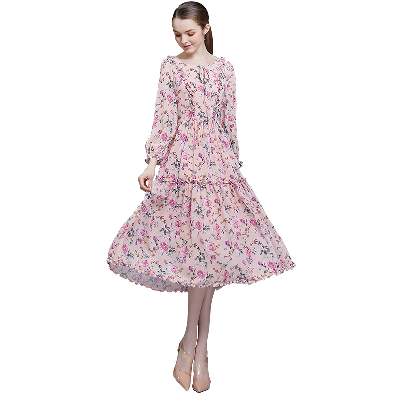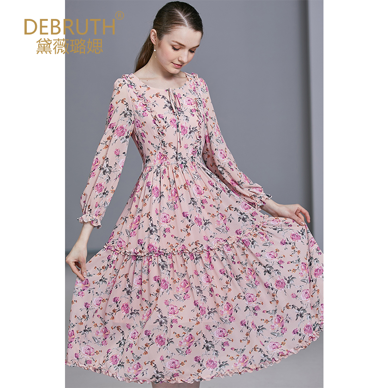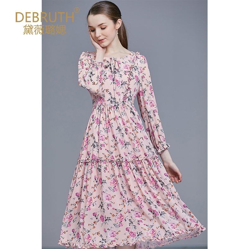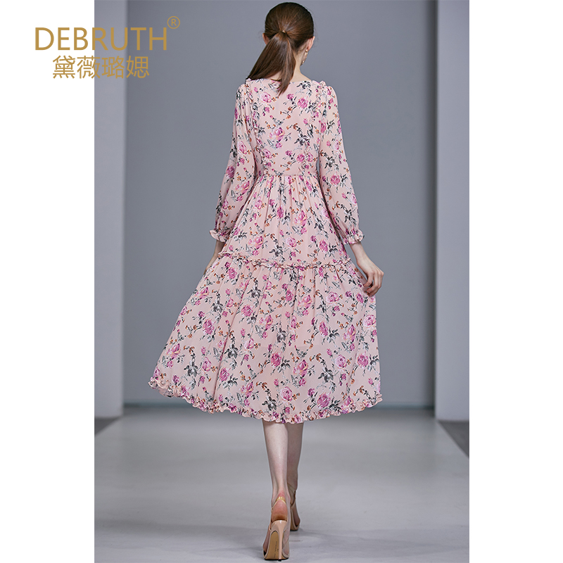 粉色长款 印花前开衩V领长袖 连衣裙 修身 Desigual25秋冬新品