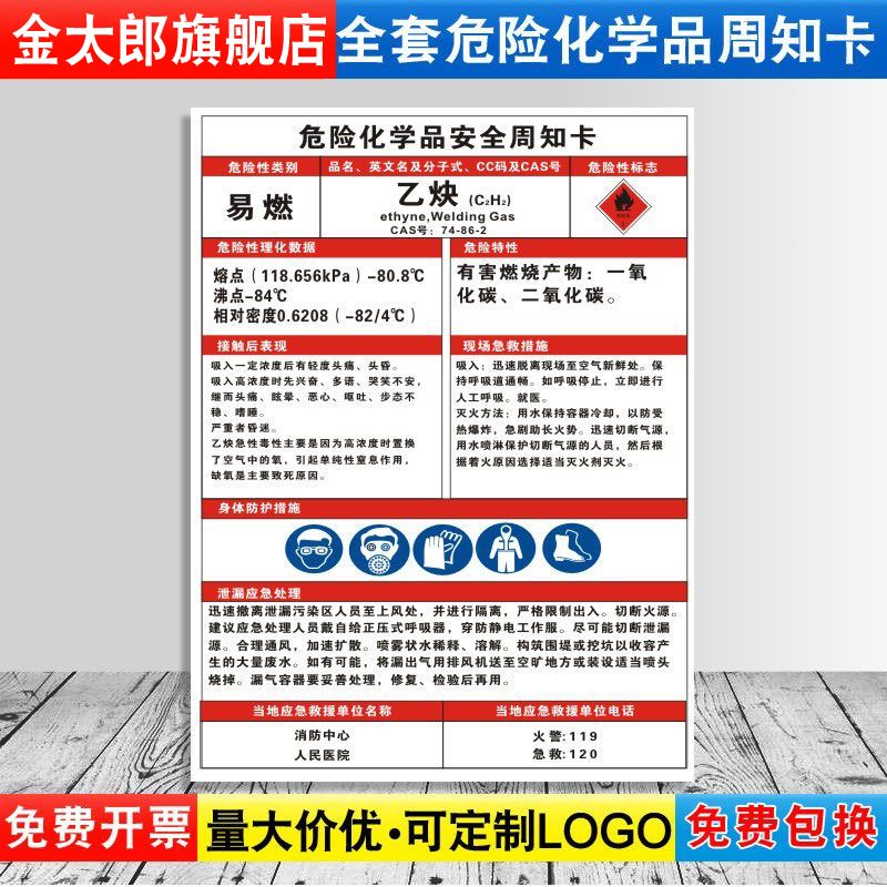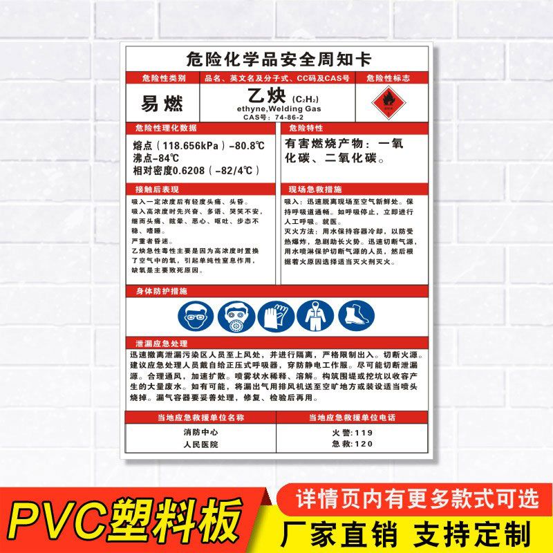 乙炔危险化学品安全周知卡职业病危害告知卡氧氩氮气混合气体MSDS气瓶存放处风险点标识标志警示牌提示定制QT