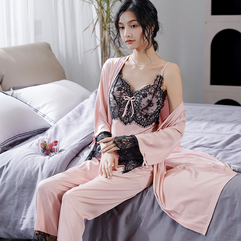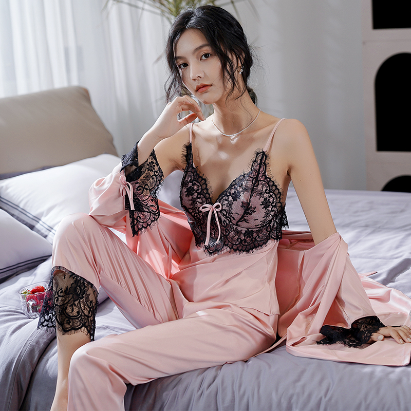 蕾丝春秋仿真丝绸家居服 性感睡袍睡裙五件套装 睡衣女夏季 冰丝薄款