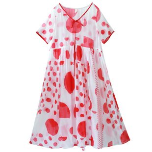 新款 复古天丝红波点长裙女夏季 V领宽松连衣裙高腰大摆裙 5折