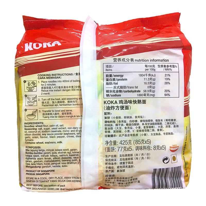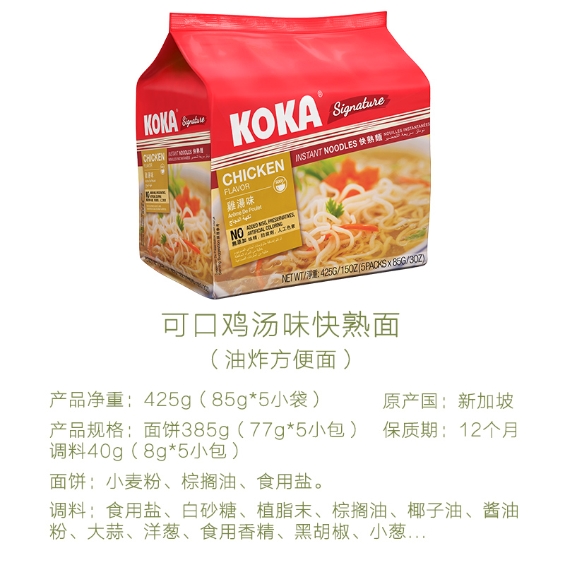 干拌面炸酱面速食拉面 包进口泡面袋装 新加坡KOKA鸡汤方便面5 85g
