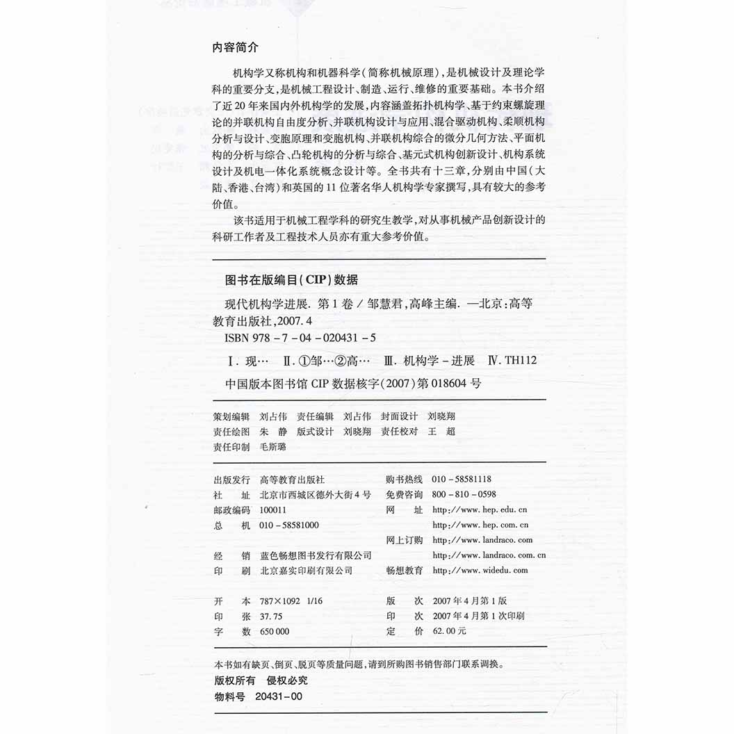 高峰主编 高等教育出版 社 现代机构学进展 适合于机械工程学科 邹慧君 机械工程前沿论丛 研究生教学参考书 第1卷