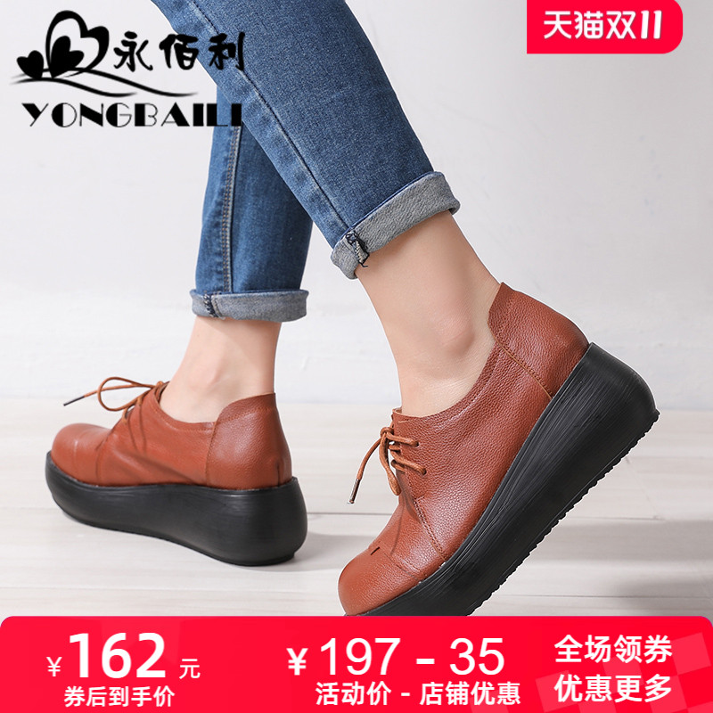 坡跟舒适松糕皮鞋 厚底真皮单鞋 圆头休闲高跟女鞋 新款 女2025春季
