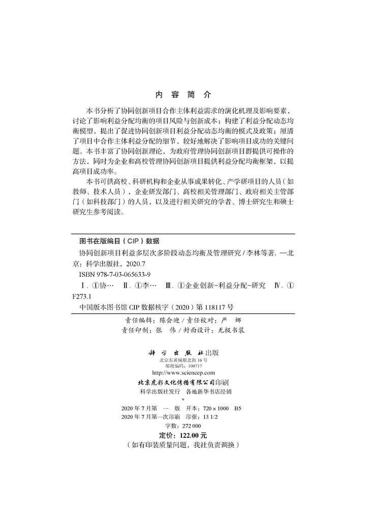 现货协同创新项目利益多层次多阶段动态均衡及管理研究科学出版 社
