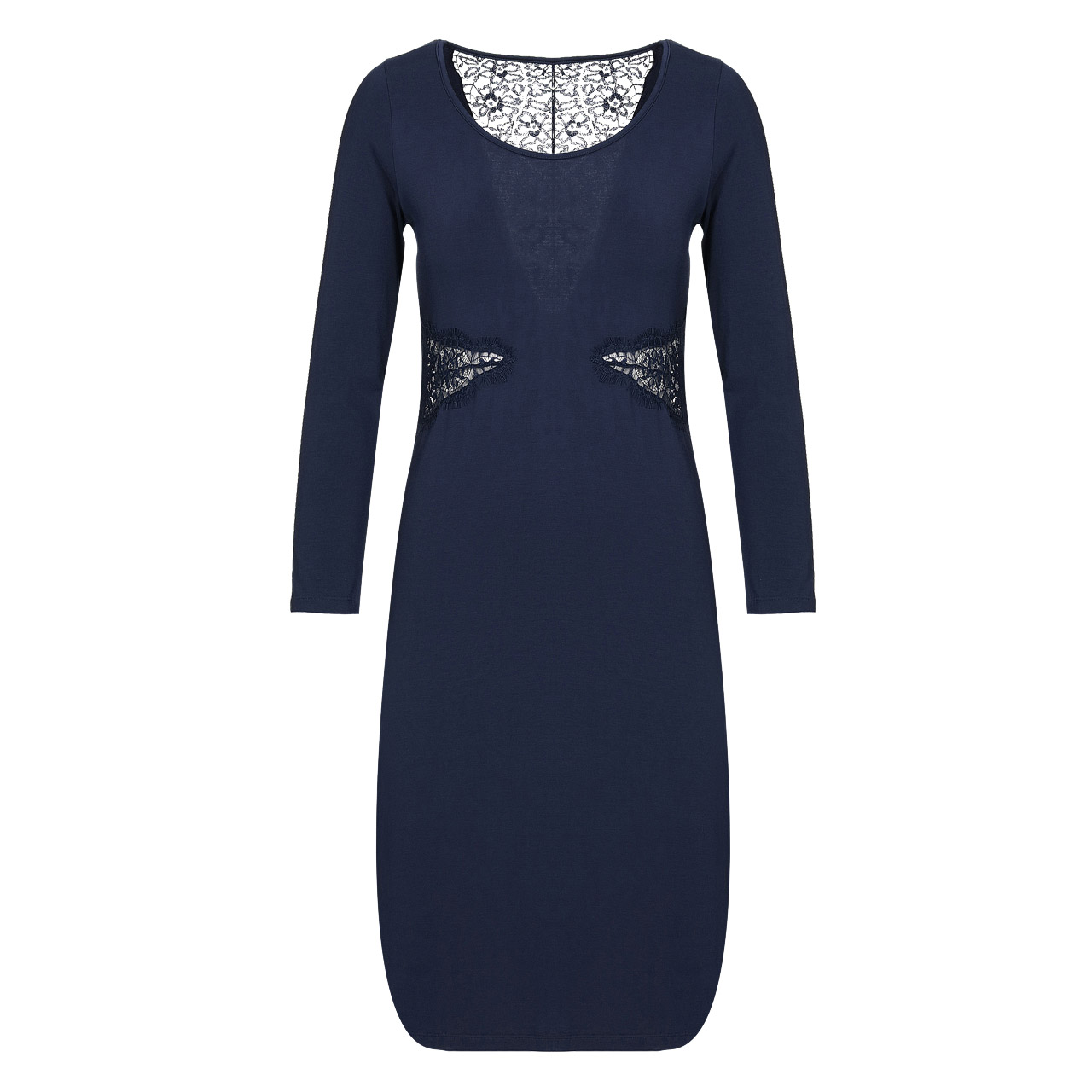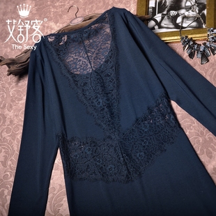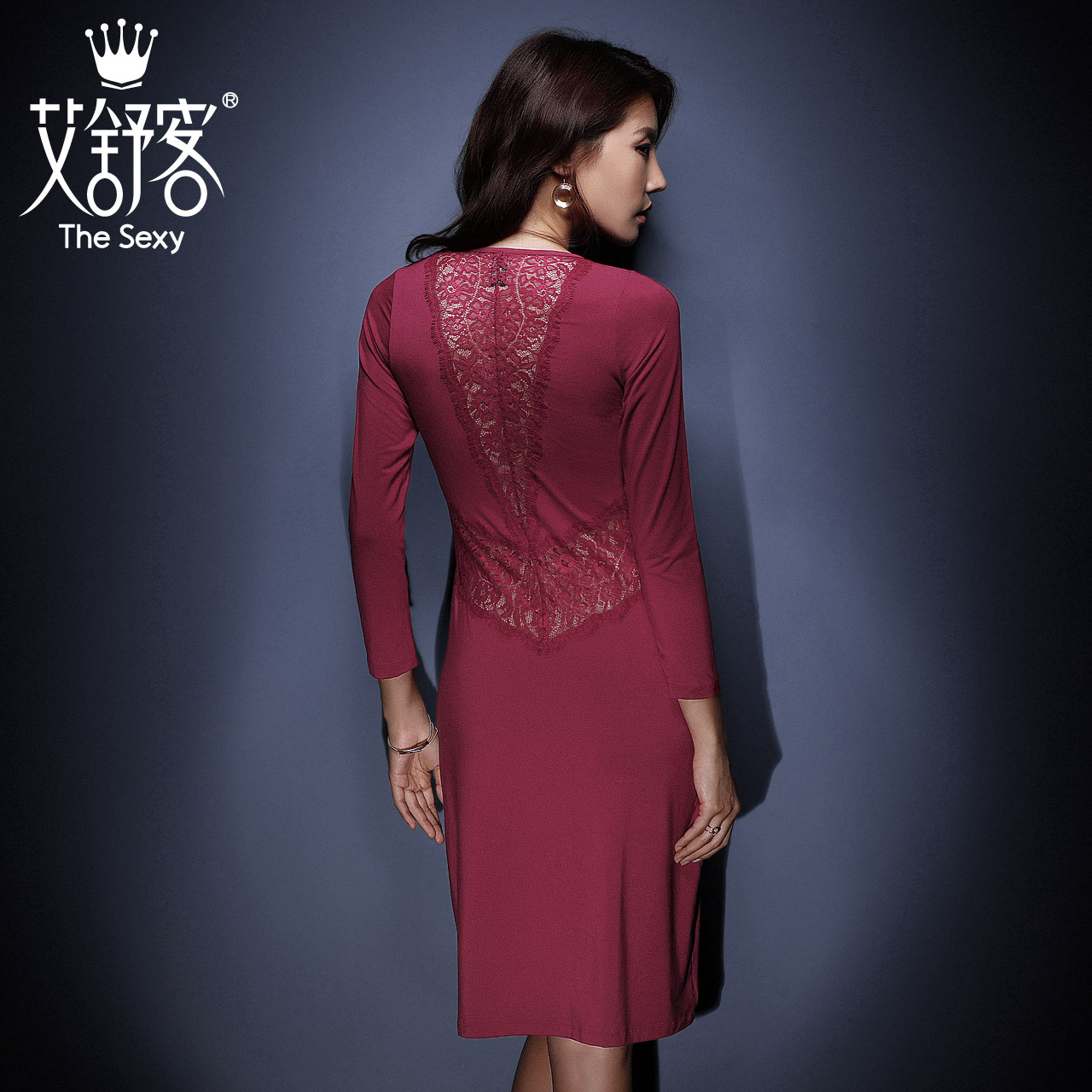 艾舒客莫代尔睡裙性感家居服女中长款 睡衣蕾丝圆领镂空可外穿 长袖