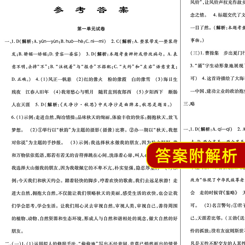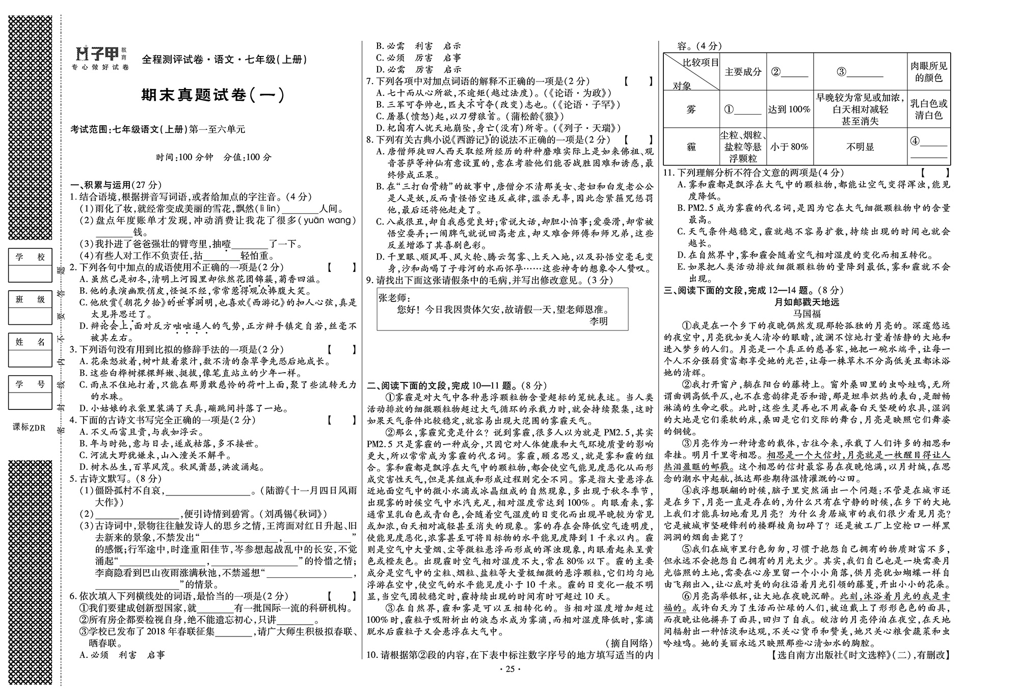子甲教育全程测评试卷 月考期中期末附参考答案祥解 初一上册语文教学辅导资料同步练习题 单元 七年级上册语文试卷人教版