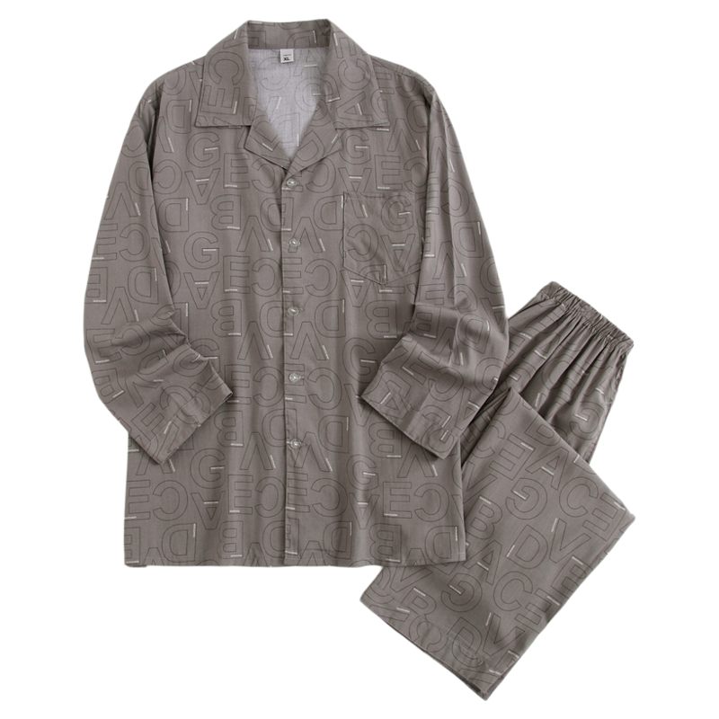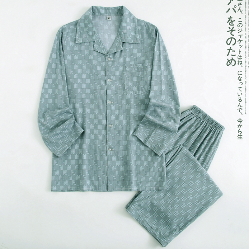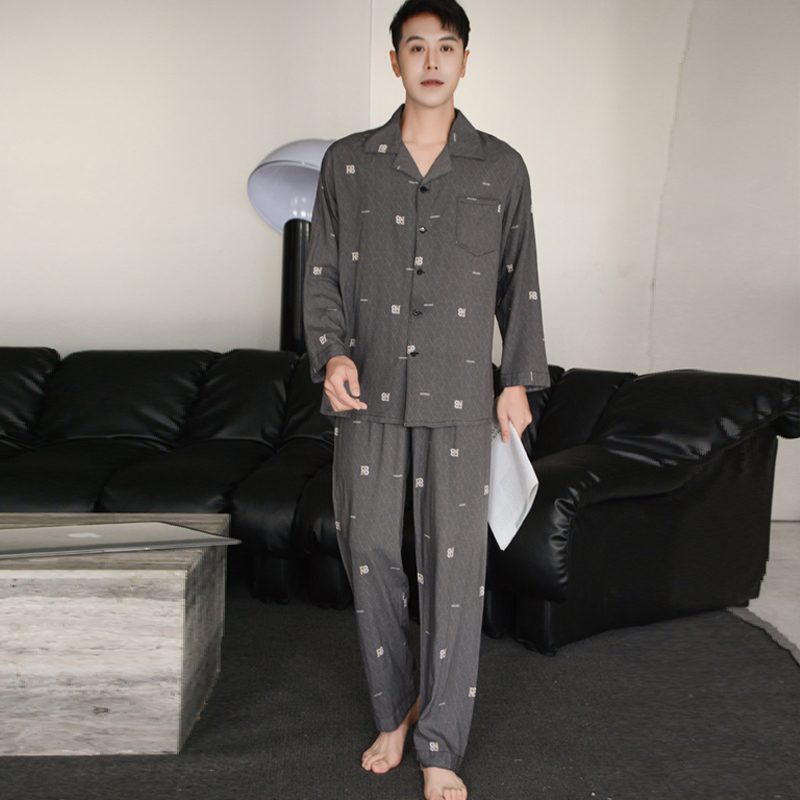 睡衣绵绸春秋家居服套装 中老年男夏空调棉绸人造棉翻领长袖 长裤