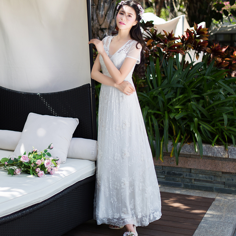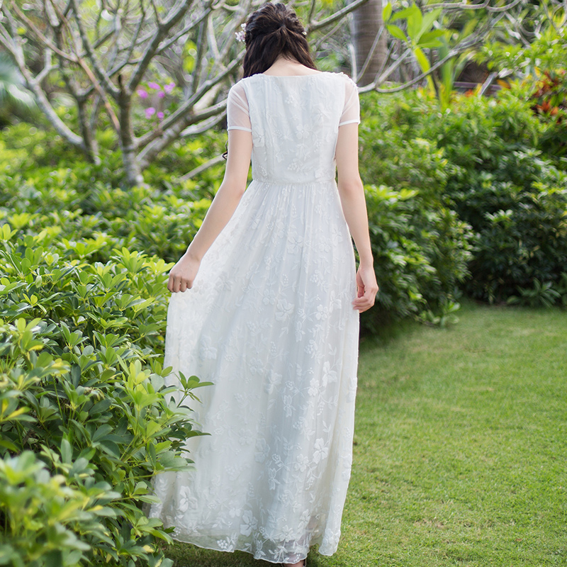 白色长裙a字御姐风连衣裙女 真丝皱绣花V领显瘦修身 美妃春夏装 新款