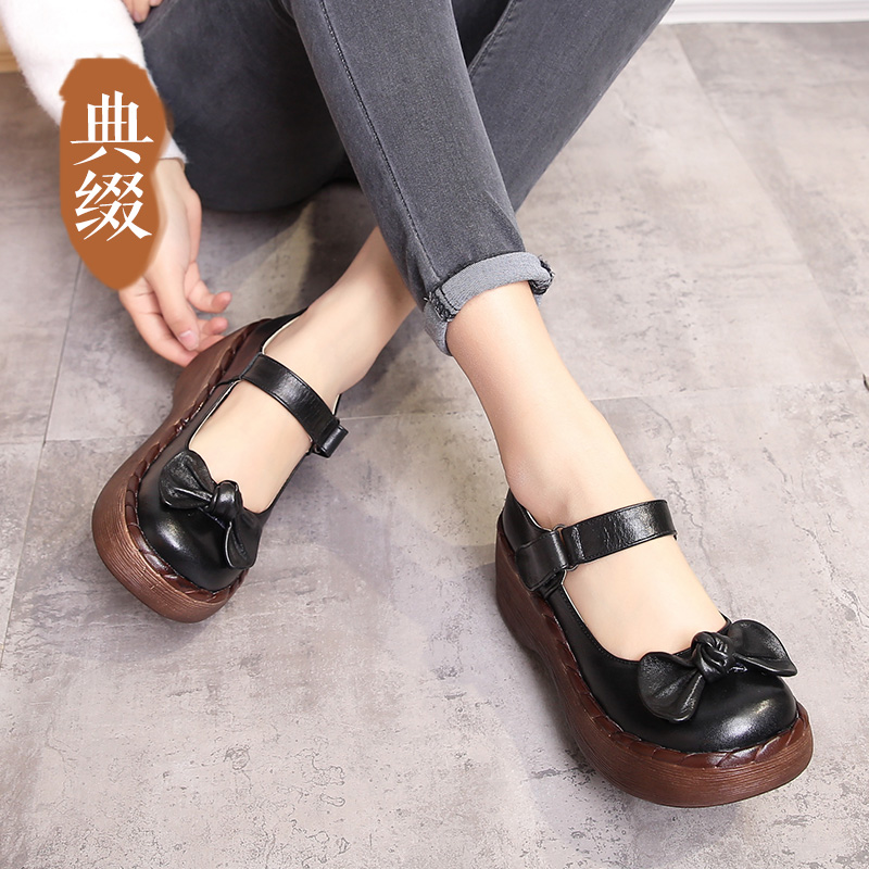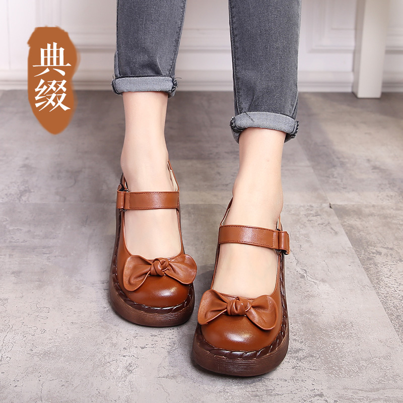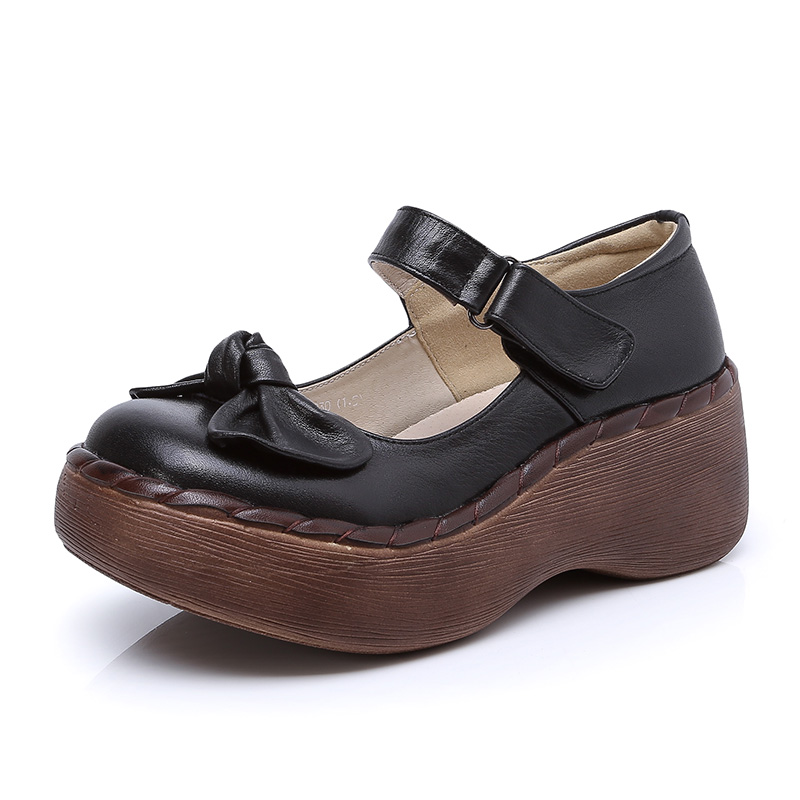 魔术贴高跟坡跟皮鞋 舒适浅口单鞋 牛皮 厚底蝴蝶结女鞋 2025春秋新款