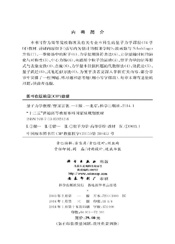 著 9787030392428 十二五普通高等教育本科国家规划教材 量子力学教程 科学出版 曾谨言 量子力学课程 社 第三版