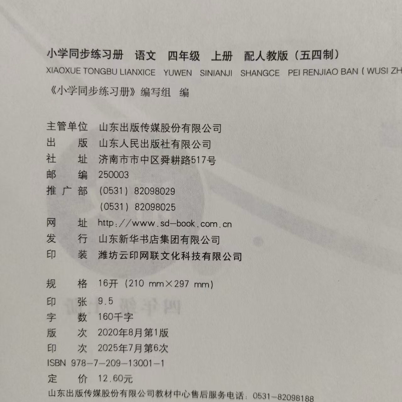 2025秋五四制人教版 社54制小学4年级语文上册同步配套练习册 小学同步练习册语文四年级上册山东人民出版
