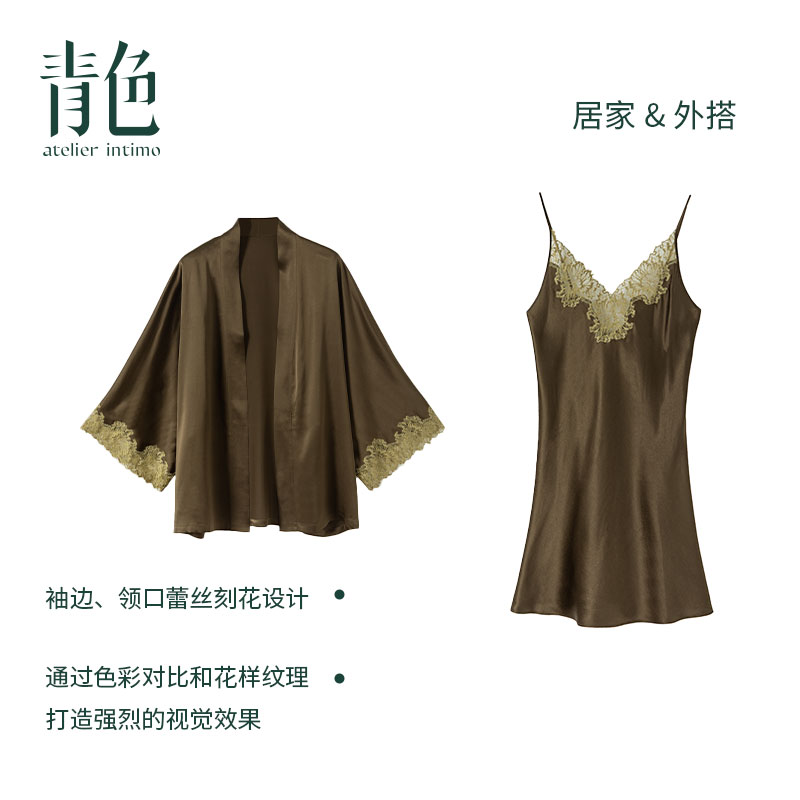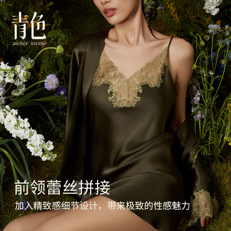 青色100%桑蚕丝真丝睡袍吊带裙女睡裙家居服 荣草外袍吊带裙