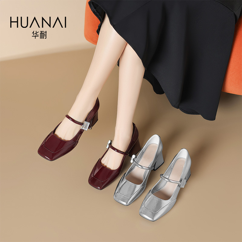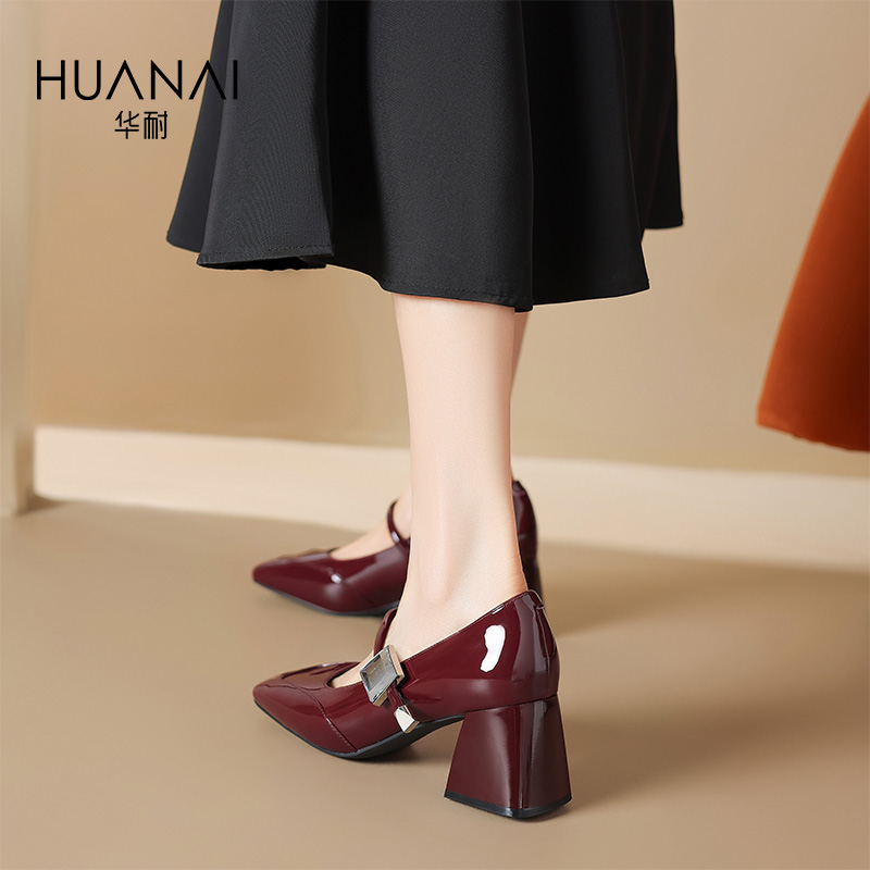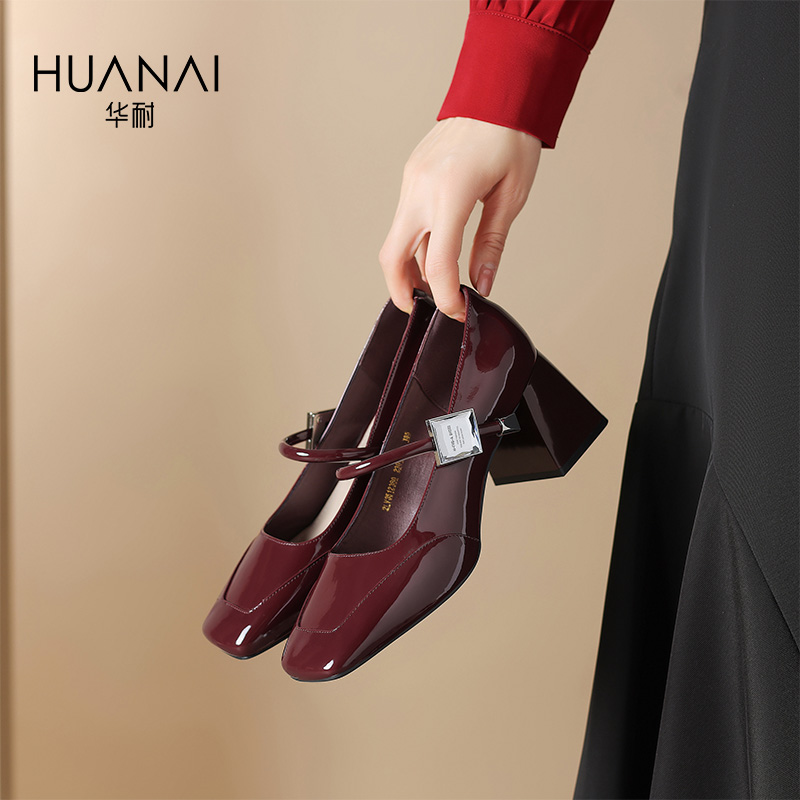 复古玛丽珍婚宴鞋 华耐红色高跟鞋 法式 一字扣带粗跟单鞋 女 2025夏季
