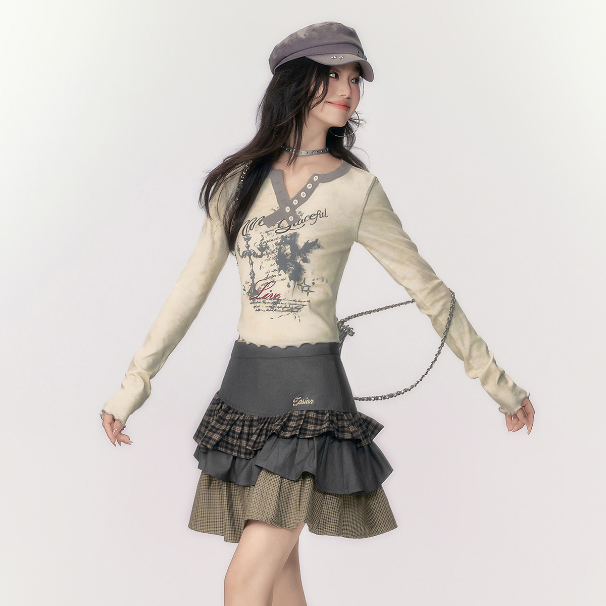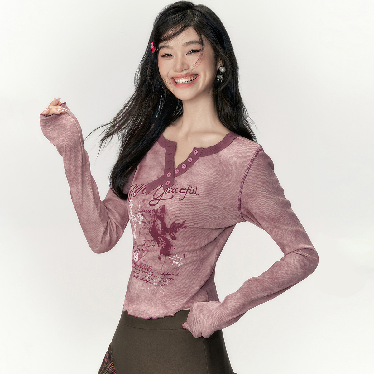 短款 EPTISON长袖 修身 新款 甜辣复古印花V领设计上衣 T恤女2025秋季