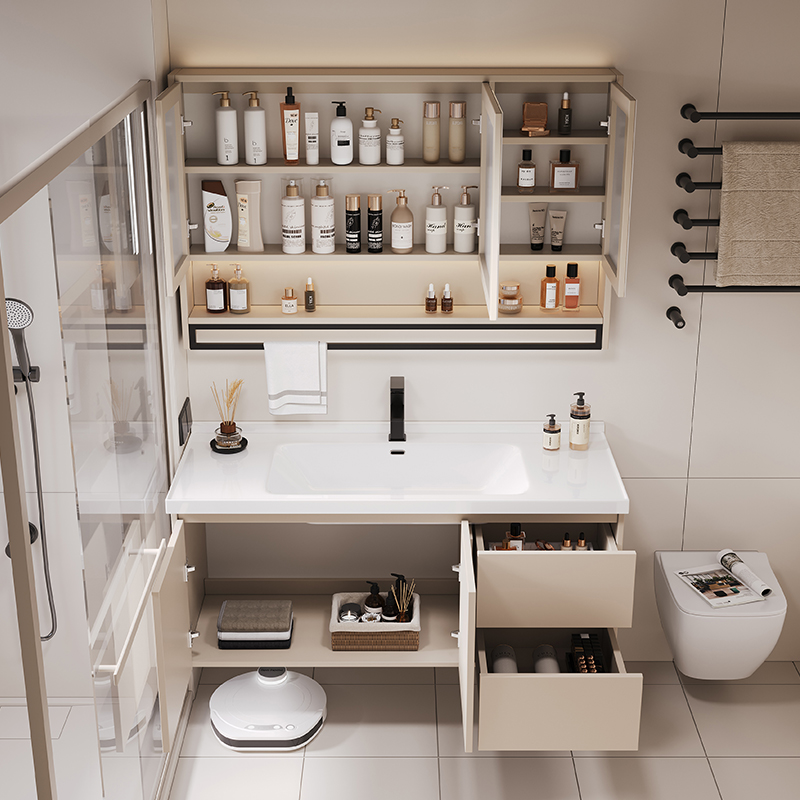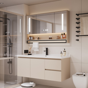 奶油风轻奢实木浴室柜组合陶瓷一体盆洗手洗脸盆智能卫生间储物柜